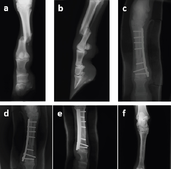 Fig. 1. Radiographic images of the third right metatarsus: (a) and (b) in dorsopalmar and lateromedial views in the preoperative period, and dorsopalmar views in the (c) immediate postoperative period, (d) fourth postoperative week, (e) second postoperative month and (f) third month after surgery and after the removal of the implants. Ethical approvalThere were no ethical concerns with the collection of data or with the management of the case. All data used in this manuscript were collected in a retrospective manner. The clients and owners of the animal approved the management of the case and this report. DiscussionHere, the authors report a successful surgical management and clinical outcome of a complete diaphyseal Mt3 fracture treatment in a pony from a circus, subject to a very demanding working activity, with a laterally applied single 4.5 mm broad DCP and respective 4.5 mm cortical screws.