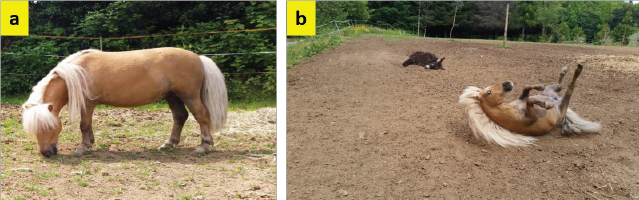 Fig. 3. Photos of the pony (a) and (b), without the cast, and fully recovered 3 months after the surgery. The etiology of Mc/t3 fractures is generally associated to intense and repeated stress efforts or trauma, namely during horse race courses and hurdle races, often with catastrophic fractures occurring specially at the lateral condyle level (Zekas et al., 1999a; Parkin et al., 2005, 2006). Also, frequently the occurrence of these type of fractures is associated to pre-existent pathology (Parkin et al., 2006). In foals generally occur simple fractures, mostly related to external trauma (Schneider and Sampson, 2020), whereas in mature horse severe comminution could occur due to high energy injuries (Bischofberger et al., 2009). The selection of animals for Mc/t3 fractures treatment is highly conditioned by the type of fracture present and the weight of the animal, especially in mature sport horses. Instable fracture fixation, mature age, bodyweight over 320 kg, infection, and increased age are strongly associated with the occurrence of postoperative complications and poor outcome in treatment of complete Mc/t3 fractures (Bischofberger et al., 2009). Thus, in highly comminuted high-energy fractures in racehorses or other athletic horses, or in open type III fractures—open, contaminated fracture with severe tissue loss (Nixon, 1996), the treatment is not indicated due to their poor prognosis (Bischofberger et al., 2009). When there is an indication for the treatment, namely in simple transverse or oblique fractures, then the scientific literature refers that rigid fixation using plates and screws is the most appropriate method for the treatment of closed or open, complete diaphyseal Mc/t3 fractures in mature horses and foals (Bischofberger et al., 2009). However, namely in small equids, the possibility of conservative treatment for this type of fracture is referred to using only immobilization of the limb with cast, especially in incomplete/non-displaced fractures (Nemeth and Back, 1991; Ladefoged et al., 2017). The clinical outcome of the present case report confirms the above mentioned, since the ORIF option with plate and screws choice was fully successful for the fracture healing in this case. However, the internal fixation was associated to a full limb cast and movement limitation during the first four postoperatively weeks to increase the likelihood of successful limb recovery. Although Bischofberger et al. (2009) recommend the use of one or two 3.5 mm broad plates or 4.5 mm narrow plates in foals or ponies, since the thickness and width of the plates should be kept as small as possible to allow the closure of the surgical wound on them, in the present clinical case we opted for the placement of a single one 4.5 mm broad plate due to the bodyweight of the pony (slightly over 100 kg) and the 4.5 mm screws stronger. However, the option of 4.5 mm DCP was less convenient in the particular aspect of the greater spacing between the holes in relation to a 3.5 mm DCP. This made it difficult to place three screws distally to the fracture focus, causing the plate distal end to get too close to the fetlock joint. The option of applying the contoured plate to the lateral, rather than cranial, surface of the Mt3 also allowed avoiding the long digital extensor tendon, minimizing possible complications involving this tendon in the postoperative period. Other reasons for the success of this case were the emergency management of soft tissue swelling with the stabilization of the fractured hindlimb in anatomically normal position, to prevent increased damage to bone and soft tissues at arrival to the hospital facilities and until the surgical fracture fixation. Also, pre- and postoperative medical management, namely through the implementation of a broad-spectrum antibiotic protocol, essential for the prevention of infection. In this clinical case, the only postoperative complications observed were a slight lysis around the first screws inserted in the distal fragment around the 20th postoperative day. Also, an articular impingement with a slight lameness and swelling of the metatarsophalangeal joint, probably caused by the plate distal end has become too close to the fetlock joint, as mentioned above. This was the main reason why the plate was removed as soon as possible, with the articular impingement fully resolved after the implant removal. Three months after fracture fixation the animal fully recovered, with clinical and radiological evidence of fracture healing, and could return to its previous activity. The originality of this clinical case results from the fact that for small equids of this weight, even with an extremely demanding physical activity such as in the present case, the option of a single plate can be used, instead of double plating, reducing the cost and risk of infection. AcknowledgmentsThis work was supported by the Portuguese Foundation for Science and Technology under the projects UIDB/AGR/04033/2020 and UIDB/CVT/00772/2020. The authors thank Dr. Maria F. Alexandre and Dr. Pedro P. Garcia for their support in the management of this clinical case. Conflict of interestThe authors declare no potential conflict of interest with the respect to this case report study, authorship, and/or publication of this article. Authors’ contributionsI. R. Dias contributed to the clinical case resolution, data collection, and writing of the first draft of the manuscript. L. M. Maia and F. C. Silva contributed to the clinical case resolution, data collection, and critical revision of the manuscript. M. Quaresma and M. Cotovio aided with the data collection, analysis and interpretation of the data, and critical revision of the manuscript. All the authors read and approved the final version of the manuscript. ReferencesBeinlich, C.P. and Bramlage, L.R. 2002. Results of plate fixation of third metacarpal and metatarsal diaphyseal fractures. Proc. Lexington, KY: AAEP, vol. 48, pp: 247–248.vol. 48