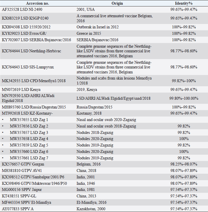 Fig. 5. Amino acid sequences alignment of ORF103 gene of current field isolates and related to LSD either virus or vaccine and SPPV and GTPV generated from database of GenBank. Despite annual mass vaccination by the Egyptian authorities with sheeppox vaccine (VSVRI, Egypt), not all vaccinated animals develop a protective level of immunity against LSDV (Tuppurainen and Oura, 2012; Gelaye et al., 2015; Rouby et al., 2021). This may be attributed to several reasons, such as the refusal of some owners to vaccinate their animals, unsuccessful vaccination, and uncontrolled animal movement together with the high stability of LSDV in the environment and presence of insect vectors (Sharawi and Abd El-Rahim, 2011; Tuppurainen and Oura, 2012; Hodhod et al., 2020). The wide route of transmission and inadequate control of the arthropod vector contribute to the difficulty in applying efficient control and eradication of LSD (Coetzer et al., 1994; Helmy et al., 2017). The sequence variation of amino acids between the outbreaks analyzed in this study with SPPV from either field isolates or vaccine derived from GenBank revealed 13 variations of nucleotides, indicating the failure of sheeppox vaccine to protect cattle against circulating isolates that cause LSD in Egypt. This finding is consistent with the reports in Israel, Ethiopia, Sudan, and Oman on LSD vaccines providing insufficient protection and causing severe reactions in cattle after immunization (Khalafalla et al., 1993; Tamam, 2006; Brenner et al., 2009; Somasundaram, 2011; Ayelet et al., 2013; Eeva et al., 2014; Gelaye et al., 2015). LSDV is believed to be introduced during imports of cattle from neighboring countries, like Kenya, as the lack of strict quarantine measures results in the rapid spread of the disease. Homologues between local isolated strains and the strain used in vaccines to control infection may be necessary to reduce the recurrent outbreaks of LSD in Egypt, instead of using the Romanian SPPV vaccine; these concurrent with rapid detection and prompt culling of infected one are effective control measures of the infection in cattle. ConclusionsTo the best of authors’ knowledge, this is the first study on molecular detection and phylogenetic analysis of LSDV in Sharkia, Egypt, using the ORF103 gene for three successive years. Molecular analysis indicated that there were no significant nucleotide mutation and amino acid variation among the current isolates during the three successive years between each other and with previous field isolates, except for a single nucleotide mutation and a single amino acid variation; this indicates that LSDV has a genetically conserved nature. These data point to the presence of genetically similar LSDVs circulating in the Egypt, and this emphasizes the transboundary nature of LSDV from a nearby nation. Furthermore, we note that outbreak viruses differ from vaccine strain viruses based on single gene sequence analysis, implying that additional assays should be performed to determine the effect of nucleotide and amino acid changes on virus pathogenicity and vaccine immunogenicity by sequencing multiple genes. AcknowledgmentsThe authors would like to thank the owner of the cases admitted to Zagazig Veterinary Clinic for their facility and collection of samples. The authors also would like to thank the workers in the Department of Animal Medicine, Zagazig University, Egypt, for their help in sample collection. Conflict of interestThe authors declare that there is no conflict of interest. Authors contributionsAll authors contributed to the concept planning, the study’s execution, the analysis of data, and the interpretation. EMF and EBA prepared the initial draft of the manuscript. All authors had complete access to all the data in the study, took responsibility for data reliability and analysis accuracy, and approved the final submission. Data availabilityData used in this article are included within the article. ReferencesAbd El-Rahim, I.H.A., El-Ballal, S. and Hussein, M. 2002. An outbreak of lumpy skin disease among cattle in upper Egypt (El-Menia governorate). Minufyia Vet. J. 2(1), 185–200. Abdallah, F.M., El Damaty, H.M. and Kotb, G.F. 2018. Sporadic cases of lumpy skin disease among cattle in Sharkia province, Egypt: genetic characterization of Lumpy skin disease virus isolates and pathological findings. Vet. World 11(8), 1150–1158. Aleksandr, K., Olga, B., David, W.B., Pavel, P., Yana, P., Svetlana, K., Alexander, N., Vladimir, R., Dmitriy, L. and Alexander, S. 2020. Non-vector-borne transmission of Lumpy skin disease virus. Sci. Rep. 10, 7436. Allam, A.M., Elbayoumy, M.K., Abdel-Rahman, E.H., Hegazi, A.G. and Farag, T.K. 2020. Molecular characterization of the 2018 outbreak of lumpy skin disease in cattle in Upper Egypt. Vet. World 13(7), 1262–1268. Al-Salihi, K. 2014. Lumpy skin disease: review of literature. Mirror Res. Vet. Sci. Anim. 3(3), 6–23. Awad, W.S., Ibrahim, A.K., Mahran, K., Fararh, K.M. and Moniem, M.I.A. 2010. Evaluation of different diagnostic methods for diagnosis of lumpy skin disease in cows. Trop. Anim. Health Prod. 42(4), 777–783. Awadin, W., Hussein, H., Elseady, Y., Babiuk, S. and Furuoka, H. 2011. Detection of Lumpy skin disease virus antigen and genomic DNA in formalin-fixed paraffin-embedded tissues from an Egyptian outbreak in 2006. Transbound. Emerg. Dis. 58(5), 451–457. Ayelet, G., Abate, Y., Sisay, T., Nigussie, H., Gelaye, E., Jemberie, S. and Asmare, K. 2013. Lumpy skin disease: preliminary vaccine efficacy assessment and overview on outbreak impact in dairy cattle at DebreZeit, central Ethiopia. Anti. Res. 98(2), 261–265. Babiuk, S., Bowden, T.R., Boyle, D.B., Wallace, D.B. and Kitching, R.P. 2008. Capripoxviruses: an emerging worldwide threat to sheep, goats and cattle. Transbound. Emerg. Dis. 55(7), 263–272. Brenner, J., Bellaiche, M., Gross, E., Elad, D., Oved, Z., Haimovitz, M., Wasserman, A., Friedgut, O., Stram, Y., Bumbarov, V. and Y