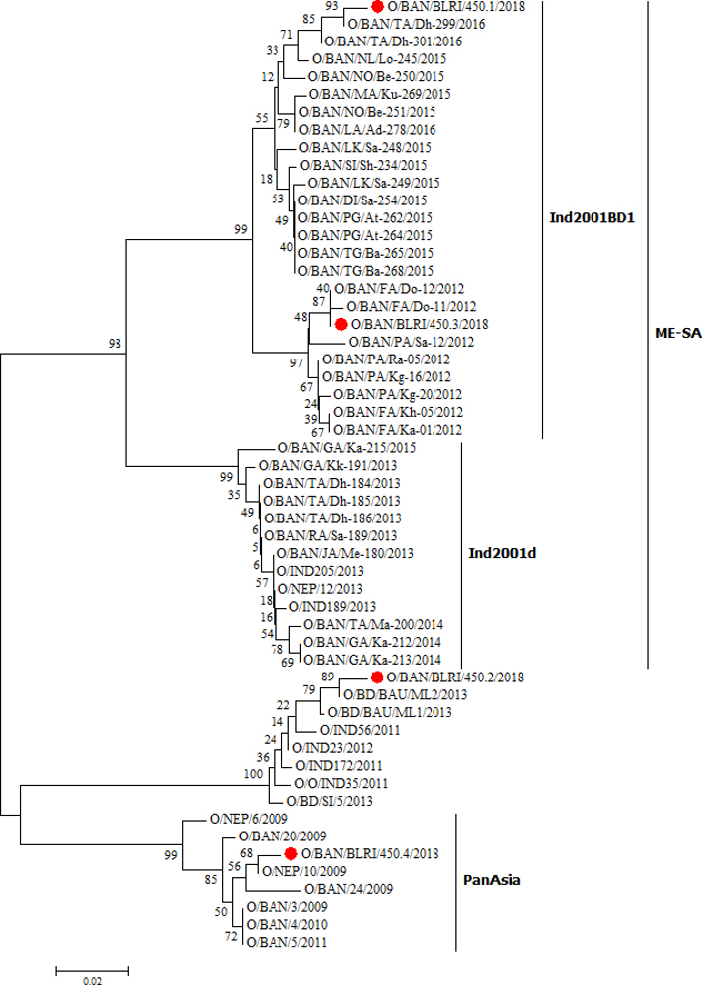 Fig. 2. The phylogenetic analysis of collected isolates and FMDV serotype O from Bangladesh, India, and Nepal from 2009 to 2016. The nucleotide sequences of the VP1 coding region constructed the phylogenetic tree by using the Tamura–Nei model under the Maximum Likelihood method. The nucleotide sequences that were generated for this study are shown in red circles. Ethical approvalThe research protocol was approved by the Animal Experimentation Ethics Committee, Bangladesh Livestock Research Institute, Savar, Dhaka 1341, Bangladesh, under reference-BLRI0006. ResultsFMDV serotype O was detected in all the four samples by RT-PCR test and the virus was isolated in BHK21 cell culture. The VP1 coding region of four isolates was sequenced and submitted to the NCBI GenBank database under assigned accession numbers MT316587–MT316590. The phylogenetic analysis revealed that all the four isolates of FMDV serotype O belong to the ME-SA topotype. Two isolates, including O/BAN/BLRI/450.1/2018 and O/BAN/BLRI/450.3/2018, became clustered within the sublineage Ind2001BD1, a newly emerged novel sublineage of lineage Ind2001 under ME-SA topotype identified in Bangladesh during 2012–2016 (Fig. 2). One isolate was clustered within the PanAsia lineage, including O/BAN/BLRI/450.4/2018. Another one isolate O/BAN/BLRI/450.2/2018 was clustered in an unnamed lineage. Analysis of sequences showed that the isolates of FMDV serotype O from Bangladesh were in a very close relationship with all sequences of FMDV serotype O in Bangladesh and the isolates of FMDV serotype O from Nepal in 2009 (O/BAN/BLRI/450.4/2018, less than 1.5% difference with O/NEP/10/2009). DiscussionFMD is an endemic disease among cattle and buffalos in Bangladesh for many years (WAHID, 2009; Loth et al., 2011). There are three serotypes of FMDV that are circulating in Bangladesh, namely serotype A, O, and Asia 1, with a prevalence of 10%–15%, 80%–85%, and 5%, respectively (Nandi et al., 2015). Therefore, FMDV serotype O is the dominating serotype over the other two serotypes (Giasuddin et al., 2016; Siddique et al., 2018). Every year a lot of FMD outbreak waves occur among the cattle of Bangladesh, which in turn causes an important economic loss. The global impact of FMD is US$ 6.5–21 billion for endemic countries and US$ >1.5 billion for FMD-free countries (Knight-Jones and Rushton, 2013). Howlader et al. (2004) estimated an economic loss of US$ 163,329 for 3,708 affected farms in Bangladesh due to FMD. However, the total economic loss due to FMD is US$ 60 million per year in Bangladesh (FAO/OIE, 2012). Since 2009, lineage Ind2001 under the ME-SA topotype of FMDV serotype O is dominating most of the outbreaks in Bangladesh (Loth et al., 2011; Siddique et al., 2018). In this study, two isolates were clustered with the sublineage Ind2001BD1 of lineage Ind2001 under the ME-SA topotype. The sublineages Ind2001BD1 and Ind2001BD2 are the two novel emergences of the FMDV serotype O in Bangladesh identified by Siddique et al. (2018). They identified 23 isolates under Ind2001BD1 and three isolates under Ind2001BD2 sublineage collected during 2012–2016 in Bangladesh. The genetic analysis showed that two isolates were closely related to isolates collected in 2012 and 2016 by Siddique et al. (2018). So, the novel sublineage Ind2001BD1 was well circulating in the Manikgonj district of Bangladesh where outbreaks occurred. The lineage Ind2001 has been divided into four separate sublineages: Ind2001a, Ind2001b, Ind2001c, and Ind2001d (Subramaniam et al., 2015). Among the sublineages, sublineage Ind2001d is the second most circulating and dominating in Bangladesh from 2009 (Loth et al., 2011; Siddique et al., 2018). But sublineage Ind2001d was not identified in this investigation, which could be a reason for the small sample size, short geographic area, and similar host. The study revealed one more isolate O/BAN/BLRI/450.4/2018 clustered within lineage PanAsia and closely related to FMDV serotype O isolated in late 2009 in Nepal (O/NEP/10/2009), with a difference of less than 1.5%. This possibly indicates a linkage of viruses between the two countries (Loth et al., 2011). A study was conducted by Giasuddin et al. (2016) who reported that the PanAsia lineage of FMDV serotype O was circulating in Bangladesh during 2011–2014. The other research group also reported that the PanAsia lineage of FMD serotype O was circulating in Bangladesh during 2012–2016 (Siddique et al., 2018). In the Indian subcontinent, there are four distinct lineages, namely Ind2001, PanAsia, PanAsia-2, and Ind2011, of the FMDV serotype O which were circulating (Subramaniam et al., 2013). The cattle trade network among India, Myanmar, and Nepal through the international border is very common and increases during big Muslim religious celebrations in Bangladesh (Loth et al., 2011). So, there is a big chance of transboundary movement of viruses from neighboring countries to Bangladesh, which is a main reason for implementing a successful FMD control program in Bangladesh. ConclusionThe investigation revealed an emerging novel sublineage Ind2001BD1 within lineage Ind2001 and lineage PanAsia along with one unnamed cluster of FMDV serotype O circulating in the outbreak area of Bangladesh. There was a closely related FMDV serotype O with a virus of Nepal, which was identified and could be a transboundary linkage. However, comprehensive studies on the current circulating viruses along with proper outbreak investigations are needed to know the genetic characteristics of viruses in Bangladesh for helping further policy decisions of FMD prevention strategy. AcknowledgmentsThis research study was funded by the development project of ‘Research on FMD and PPR in Bangladesh’ (Award no. MOFL-7080) of the Ministry of Fisheries and Livestock, Bangladesh. The authors would like to thank M.A. Sabur and Eusha Islam, members of the outbreak investigation team. The authors are also thankful to Shar