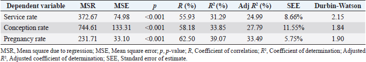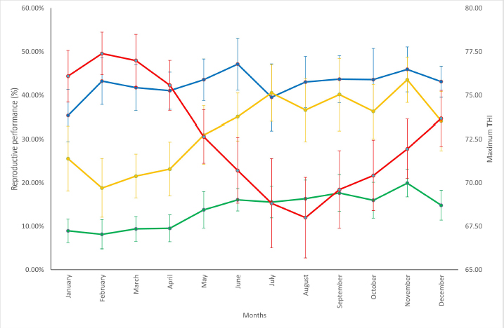 Fig. 1. Relationship between monthly service rate (blue line), conception rate (yellow line), pregnancy rate (green line), and max THI (red line) in different months of the year. Table 1. Goodness of fit estimates for the regression model for service, conception, and pregnancy rate of dairy farms in Lima.