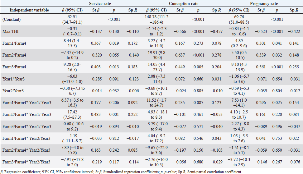 AbstractBackground: Heat stress results in a mild reduction in milk production, while long-term heat stress exposure can severely affect the productive and reproductive performance in dairy cattle. Aim: To quantify the relationship between reproductive performance and temperature–humidity index in dairy cattle farms in Lima, Peru. Methods: Monthly service, conception, and pregnancy rates were measured from four dairy farms in four different Lima localities as reproductive performance indicators, along with an index of heat stress and maximum daily temperature–humidity index (max THI), during a 3-year period. In order to establish the relationship between the max THI and the reproductive performance indicators, a multiple regression analysis was carried out, which considered farm and year as explicative variables. Results: The regression model showed an adjusted R2 of 33.5% with an estimated standard error of 5.75% and was highly significant (p < 0.001). The regression coefficients for max THI for the variables pregnancy rate and conception rate were significant (p < 0.0001). With every increasing unit of max THI, a 0.84% drop in the pregnancy rate and a 1.74% drop in the conception rate were estimated by the model. The regression coefficient of max THI for the service rate variable was not significant. Conclusion: It was concluded that the increase in max THI significantly affected the reproductive performance of intensive dairy cattle farms in Lima. Keywords: Reproductive performance, Temperature–humidity index, Dairy cattle, Heat stress. IntroductionHomeothermy is the capability of an organism to maintain a stable body temperature independently of environmental fluctuations. However, when the homeothermy of an organism is disturbed, it experiences stress (Ruiz et al., 2017). Heat stress occurs when the organism is incapable of getting rid of heat excess and as a result many physiological functions are affected. It has been widely known as one of the main factors that affect livestock animals’ productivity, reproductive efficiency, and health on a global scale (Allen et al., 2013; Boni et al., 2014; Dash et al., 2016). Short-term heat stress results in a mild reduction in milk production, while long-term heat stress exposure can severely affect the productive and reproductive performance in dairy cattle (St-Pierre et al., 2003). The dairy industry suffers relevant economic losses every year due to heat stress. It has a negative impact on the productive and reproductive performances of dairy cattle, incrementing production costs and lowering farmers’ total annual income (St-Pierre et al., 2003; Ruiz et al., 2017). Cows that undergo heat stress have two types of chilling mechanisms: non-evaporative (convection and conduction) and evaporative (sweating and panting). The non-evaporative mechanisms are not very efficient if the ambient temperature increases. Likewise, the evaporative mechanisms are inefficient when relative humidity is high (West, 2003). That is why places with hot and humid conditions do not allow the animal to dissipate enough body heat to prevent heat stress (Ruiz-García et al., 2019). In Peru, previous studies have shown that cattle suffer heat stress in the warm seasons of the year in the northern and central regions of the country (Flamenbaum, 2011; Ruiz et al., 2017). Lima, which is in the central coast, has a warm climate with high relative humidity almost the entire year, so cows are constantly under heat stress which affects their productive and reproductive performance. It has been previously determined that dairy cattle in the main production areas of Lima experience heat stress almost all year round (Ruiz et al., 2017; 2019). The temperature–humidity index (THI) effectively summarizes the combined effect of environmental temperature and relative humidity, and it is used as a heat stress indicator in humans and animals (Dash et al., 2016). Heat stress is operationally defined when THI surpasses a species-dependent threshold, which for dairy cows has been determined at 70 units (St-Pierre et al., 2003; Pinto et al., 2020). It has been shown that maximum daily THI (max THI) is related with the adverse effects of heat stress on dairy cattle (Ravagnolo et al., 2000). The impact of heat stress on the productive performance has been reported on dairy cattle of Lima showing a negative correlation between mean daily THI, and both milk production and milk total solids (Ruiz-García et al., 2018). Implementation of appropriate cooling systems on dairy cattle farms in Peru has the potential to increase annual production by 10% (Flamenbaum, 2011). However, this percentage could be even higher, as there are no studies quantifying the impact of heat stress on the reproductive performance of dairy cattle in Peru. Thus, the objective of this study was to determine the relationship between max THI, an indicator of heat stress, and the reproductive performance of dairy cattle farms in Lima, Peru. Materials and MethodsStudy site and time spanThe study was conducted from August 2010 to July 2013 in the four main dairy cattle localities of Lima, Peru: Vegueta, Huacho, Lima, and Cañete. Meteorological data were obtained from the closest station to each farm run by the Peruvian National Service of Meteorology and Hydrology (SENAMHI). The stations consulted for this study were Vegueta (Estación Camay, 10°54ʹ46.58″S, 77°38ʹ56.03’’W), Huacho (Estación Alcantarilla, 11°3ʹ38.45″S, 77°33ʹ0.38″W), Lima (Estación Villa Maria del Triunfo, 12°9ʹ59.01″S, 76°55ʹ11.99″W), and Cañete (Estación Pacaran, 12°51ʹ81″S, 76°03ʹ28.54″W). Meteorological data were used to estimate the mean monthly max THI. Herd and barnA total of four barns in four different localities of Lima were used for the study. All studied farms had at least 200 Holstein cows and were base-fed with forage and concentrated feed. All farms performed mechanical milking and artificial in