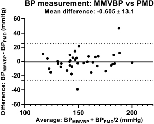 Fig. 2. Bland–Altman plot for analyses of agreement between PMD and MMVBP for SBP measurement in 40 conscious dogs. The solid horizontal line represents the bias and the dotted lines represent 95% LoA (±1.96 SD from the mean between the two devices used). Note that the MMVBP device slightly underestimated SBP compared to the PMD device. LoA, limits of agreement; MMVBP, Mano Médical Vet BP; PMD, Parks Medical Doppler; SBP, systemic blood pressure. In this study, the CVs from the five consecutive SBP readings for the two devices were similar (4.09% for the MMVBP and 3.86% for the PMD), suggesting a clinically acceptable intra-observer repeatability of both devices. Similar CVs have been previously reported when Doppler ultrasonography devices, such as the PMD, were used (Hsiang et al., 2008; Chetboul et al., 2010; Wernick et al., 2012a). As suggested in the ACVIM consensus statement, categorization of SBP based on TOD risk can be useful when assessing the need for antihypertensive treatment (Acierno et al., 2018). In our study, four dogs (10% of the study population) were classified with a score of 3 (SBP between 160 and 179 mmHg) with one device but with a score below 3 with the other. This finding could have resulted in significantly different clinical outcomes, e.g., different SBP treatment or monitoring regimes, as per ACVIM consensus recommendations (for those without evidence of TOD). Such results suggest that this scoring system should be applied with caution and ideally be based on repeated sets of measurements obtained from the same dog over time (taking intraindividual variability in SBP into account). There were a number of limitations in this study. The small study population could have impacted on the level of agreement between the devices by decreasing the statistical power; a narrower level of agreement might have been seen if more dogs had been enrolled. While this is a potential limitation, lower sample numbers have been previously used in similar studies (Jepson et al., 2005; Chetboul et al., 2010; Wernick et al., 2012b). The inclusion of more dogs with an SBP ≥ 180 mmHg would have allowed for a more accurate evaluation of the agreement between devices under high SBP conditions (only eight dogs had an SBP ≥ 180 mmHg). There were also few dogs with a low SBP, but they were excluded because assessment could have" should be "There were also few dogs with low SBP because these were excluded if assessment could have The aim of this study was not to validate the MMVBP. Further research in which the performance of the MMVBP is compared to the gold standard direct method, ideally in conscious dogs, is needed to elucidate the device’s accuracy (Haberman et al., 2006; Seliškar et al., 2013). This would hopefully allow for refinement of the validation criteria for this device, as well as for the establishment of monitor-specific reference intervals (Jepson et al., 2005; Acierno et al., 2018). ConclusionIn conclusion, the results of the present study suggest that the MMVBP and the PMD can be used interchangeably for assessment of SBP in conscious dogs. The wide LoA observed between both devices were most likely associated with intraindividual variability in SBP over time. Clinicians should be aware of the possibility for clinically relevant discrepancies between sets of SBP measurements obtained at different times with either device. AcknowledgmentsThe authors would like to thank the owners of the dogs in this study for allowing their dogs’ inclusion, including Dr Hester Cheuk for handling all of the dogs so well. ReferencesAcierno, M.J., Brown, S., Coleman, A.E., Jepson, R.E., Papich, M., Stepien, R.L. and Syme, H.M. 2018. ACVIM consensus statement: guidelines for the identification, evaluation, and management of systemic hypertension in dogs and cats. J. Vet. Intern. Med. 32(6), 1803–1822. Bodey, A.R., Michell, A.R., Bovee, K.C., Buranakurl, C. and Garg, T. 1996. Comparison of direct and indirect (oscillometric) measurements of arterial blood pressure in conscious dogs. Res. Vet. Sci. 61(1), 17–21. Bosiack, A.P., Mann, F.A., Dodam, J.R., Wagner-Mann, C.C. and Branson, K.R. 2010. Comparison of ultrasonic Doppler flow monitor, oscillometric, and direct arterial blood pressure measurements in ill dogs. J. Vet. Emerg. Crit. Care 20(2), 207–215. Chetboul, V., Tissier, R., Gouni, V., de Almeida, V., Lefebvre, H.P., Concordet, D., Jamet, N., Sampedrano, C.C., Serres, F. and Pouchelon, J.L. 2010. Comparison of Doppler ultrasonography and high-definition oscillometry for blood pressure measurements in healthy awake dogs. Am. J. Vet. Res. 71, 766–772. Chetboul, V. 2015. Intra- and interoperator variability. In: Eds., de Madron, É., Chetboul, V., and Bussadori CBT-CE of the D and C. St. Louis, MI: Elsevier Masson, pp: 39–43. Finco, D.R. 2004. Association of systemic hypertension with renal injury in dogs with induced renal failure. J. Vet. Intern. Med. 18(3), 289–294. Haberman, C.E., Kang, C.W., Morgan, J.D. and Brown, S.A. 2006. Evaluation of oscillometric and Doppler ultrasonic methods of indirect blood pressure estimation in conscious dogs. Can. J. Vet. Res. 70(3), 211–217. Hinkle, D.E., Wiersma, W. and Jurs, S.G. 2003. Applied statistics for the behavioral sciences. J. Educ. Stat. 15(1), 84. Hsiang, T.Y., Lien, Y.H. and Huang, H.P. 2008. Indirect measurement of systemic blood pressure in conscious dogs in a clinical setting. J. Vet. Med. Sci. 70(5), 449–453. Jepson, R.E., Hartley, V., Mendl, M., Caney, S.M.E. and Gould, D.J. 2005. A comparison of CAT Doppler and oscillometric memoprint machines for non-invasive blood pressure measurement in conscious cats. J. Feline Med. Surg. 7(3), 147–152. Littman, M.P., Robertson, J.L. and Bovée, K.C. 1988. Spontaneous systemic hypertension in dogs: five cases (1981–1983). J. Am. Vet. Med. Assoc. 193(4), 486–494. Marino, C.L., Cober, R.E., Iazbik, M.C. and Couto, C.G. 2011. White-Coat effect on systemic blood pressu