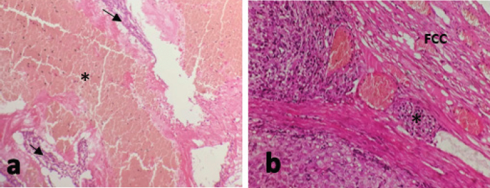 Fig. 3. (a): The tumor cells show areas of hemorrhages (asterisk) and necrosis (arrows). (b): The (FCC shows blood vessel lined by endothelial cells (vascular invasion) (asterisk). (H&E stain; a: 100×; b: 200×).