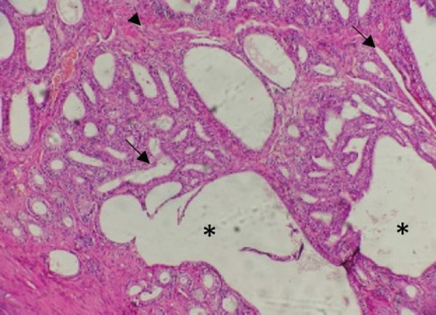 Fig. 4. CEH. The endometrium showed thickened endometrial lining with elongated glands (arrows) and prominent stroma (arrowhead), dilatation of the glands with formation of variable sized cysts (asterisks). (H&E stain; 100×). Based on histological findings, the GCT of the ovary with evidence of vascular invasion associated with CEH was made and the contralateral ovary and fallopian tube were free. The surgical intervention resulted in the complete resolution of clinical signs. However, 6 months following surgery the cat was brought to the Albittar clinic again with complaints of weakness, cachexia, ascites, off food, and lethargy with the presence of abdominal mass. Sings of pain were determined on palpation of the right abdominal region and ultrasonography examination was performed. According to the ultrasonography examination, a clear mass at the mesogastric region attached to the right kidney was determined and was suspected as a sequela of past tumor metastasis. Since the poor prognosis surgery was not performed, the cat had paralysis in hind limbs and massive weight loss after one week and eventually died. The owner of the cat rejected the euthanized decision and the postmortem examination. DiscussionGCTs are the most common sex-cord stromal tumors in many animal species and the most common ovarian tumors in felines (Norris et al., 1969; Aliakbrai and Ivoghli, 1979; McEntee, 2002). In the current case, the histopathological findings in accordance with the previous studies that described feline GCT (Kennedy et al., 1998; Gunay Ucmak et al., 2018). These features correspond with different reported cases which document the aggressive behavior of this tumor in cats (Baker, 1956; Norris et al., , 1969; Giacóia et al., 1999). The mean age preference of GCTs in cats is generally 11 years old (Holzworth, 1987), however, the presented case was only 5 years old. The reappearance of the lesion in kidney after 6 months of surgery supported the severe malignancy of the GCTs case (Gelberg and McEntee, 1985). Previously, kidney was reported among metastatic sites for GCTs associated with old cats (McEntee, 2002). In addition, Oviedo-Peñata et al. (2020) reported that GCTs in dogs frequently affect the left ovary; however, this was not the case in cats which some authors described GCTs in both ovaries (Giacóia et al., 1999; Heaps et al., 2017). Ultrasonographic imaging of the ovaries is typically used for the diagnosis of GCTs and supports the surgery intervention (Gunay Ucmak et al., 2018). This technique was useful to reveal the existence of echogenic irregular mass in the right ovary in the current case, and also was helpful to supplement histological findings of GCTs and further support our diagnosis and surgical intervention. The current case of GCT was also diagnosed with mild to severe lesions of CEH. Endometrial hyperplasia with GCTs has been previously reported in some cats and dogs associated with estrogenic effects on the uterus (Giacóia et al., 1999; Heaps, et al., 2017). Endometrial hyperplasia was mostly seen in older cats and was related to age and the effect of estrogen stimulation but not progesterone (Potter et al.,1991). Typically, GCT is usually associated with clinical signs in particular the repeated estrus considered an important differential diagnostic sign (Giacóia et al., 1999). Such association was evident, showing clinical signs like vigorous and progressive behavioral changes after 1 month of mating. In addition, the current case had CEH with no evidence of inflammation corresponding with other findings that reported hyperplasia but no evidence of inflammation (Foster, 2006). Persian cats appear to be particularly sensitive to low light levels and more prone to infrequent estrous cycles. This breed will not exhibit regular estrous cycle even during daylight, which is the common cause of infertility in queens (Little, 2012). CEH influenced by chronic estrogenic stimulation from recurrent estrous cycle that does not result in pregnancy (Potter et al., 1991). Pets with a clinical history of infertility and changes in the time of proestrus or estrus should be examined and a GCT should be included in the differential diagnosis (Toledo et al., 2021). In this case, the cat was of Persian breed with clinical history of infertility and exhibited vigorous behavior during the estrous cycle, all these signs suggest that the breed may play a role to develop a GCT and CEH. OHE remains the basis and recommended treatment for ovarian tumors. The current case complains of weakness, loss of appetite, massive weight loss, cachexia, ascites, lethargy, abdominal enlargement at mesogastric region and a mass attached to the right kidney after 6 months of surgery. This is widely reported that surgical procedures do not improve the prognosis of these types of tumors (Gunay Ucmak et al., 2018). Due to poor prognosis of such cases, no further intervention was performed and the cat eventually developed paralysis in its hind limbs and died. The cause of ovarian tumors in cats is not fully understood but the condition is closely associated with certain risk factors such as age, spaying, hormonal instability, and infection (McEntee, 2002). Nevertheless, ovarian tumors in pets are mainly linked to different risk factors including environmental and genetic factors, e.g., hereditary and prone to metastasizing (Dobson, 2013; Cannon, 2015). In the current case, the breed is possibly a potential risk factor that may play a role to develop a GCT and CEH; however, the pathogenesis of GCT and CEH may be multifactorial and requires further study. A GCT should be included in the differential diagnosis in cats with a clinical history of infertility and changes in the time of proestrus or oestrus, particularly not spayed Persian cat. To conclude, this paper reports a GCT and CEH in a cat. Although GCTs in cats were reported by many researchers around the world, this is the first report from Libya according 