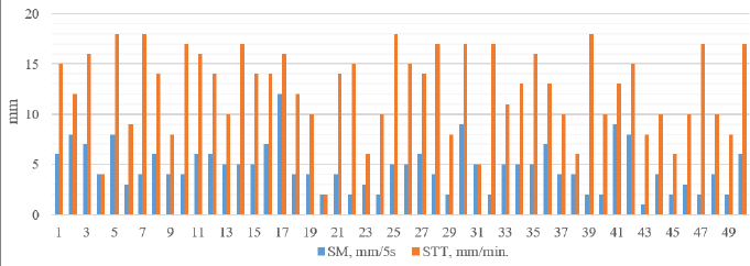 Fig. 3. Individual results of STT and SM in 50 eyes.c On average, STT is higher in dogs, ranging from 20.4 ± 2.89 to 23.56 ± 3.98 mm/minute (Hartly et al., 2006; Visser et al., 2017), than in cats, where it ranges from 13.7 ± 4.6 to 15.7 ± 3.7 mm/minute (Sebbag et al., 2020). This difference possibly correlates with SM results. Rajaei et al. (2018) reported results for dogs where STT averaged 15.10 mm/minute and SM averaged 9.66 mm/5 seconds. However, in cats they reported STT as 11 mm/minute and SM as 10.5 mm/5 seconds. These results for cats do not correlate with those obtained for dogs. As for the cats, the results from STT and SM were similar. In our research, we found a significant medium positive correlation between the STT and SM results for cats (r=0.411; p=0.003) (Fig. 2). The STT and SM results for the individual cats are shown in Figure 3. The SM should be evaluated according to the cat’s eye position—brachiocephalic cats or normaloid cats—and age for more precise results. However, the authors of this study advise clinicians to perform the STT-1 as part of their ophthalmic examination in cats, particularly in cats with an ocular surface disease. More data is needed to assess the values for SM at different stages of keratoconjunctivitis and understand at what level SM values increase during painful conditions. In every case, both the STT and SM should be evaluated according to the animal’s clinical status and the results of other diagnostic tests. Conflict of interestThe authors declare that there is no conflict of interest. Authors contributionsLK conceptualized the aim of the study, designed, planned, and supervised the analysis and corrected the manuscript. LŠ and LK conceived the work and performed all animal examinations and tests. AM analysed the data, prepared the graphs, figures and tables, and drafted the manuscript. All authors read, reviewed, discussed, and agreed to their individual contributions prior to and during submission of this article. AcknowledgmentsThis work was supported by the framework of LLU, specifically: “The effects of drug use habits on the eye microbiota antimicrobial resistance in dogs” (LLU P18). ReferencesAftab, G., Rajaei, S.M. and Faghihi, H. 2018. Comparison of the Schirmer tear test I values after placement in ventral and dorsal conjunctival fornices in healthy cats. J. Feline Med. Surg. 20(12), 1169–1172. Dilly, P.N. 1994. Structure and function of the tear film. Adv. Exp. Med. Biol. 350, 239–247. Dogru, M., Ishida, K., Matsumoto, Y., Goto, E., Ishioka, M., Kojima, T., Goto, T., Saeki, M. and Tsubota, K. 2006. Strip meniscometry: a new and simple method of tear meniscus evaluation. Invest. Ophthalmol. Vis. Sci. 5, 1895–1901. Grahn, B.H. and Storey, E. S. 2004. Lacrimostimulants and lacrimomimetics. Vet. Clin. North Am. Small Anim. Pract. 3, 739–753. Hartly, C., Williams, D. and Adams, V.J. 2006. Effect of age, gender, weight, and time of day on tear production in normal dogs. Vet. Ophthalmol. 9(1), 53–57. Ibrahim, O.M., Dogru, M., Ward, S.K., Matsumoto, Y., Wakamatsu, T.H., Ishida, K., Tsuyama, A., Kojima, T., Shimazaki, J. and Tsubota, K. 2011. The efficacy, sensitivity, and specificity of strip meniscometry in conjunction with tear function tests in the assessment of tear meniscus. Invest. Ophthalmol. Vis. Sci. 5, 2194–2198. Kazama, Y., Wakaiki, S., Washita, H.I. and Saito, A. 2014. A novel method of lacrimal function testing: strip meniscometry. In First International Conference on Ocular Surface Diseases in Dogs and Cat, 2014 March 6–8, Niseko, Japan, 2014. Kovalcuka, L. and Nikolajenko, M. 2020. Changes in intraocular pressure, horizontal pupil diameter, and tear production during the use of topical 1% cyclopentolate in cats and rabbits. Open Vet. J. 10(1), 59–67. Lim, C.C., Reilly, C.M., Thomasy, S.M., Kass, P.H. and Maggs, D.J. 2009. Effects of feline herpesvirus type 1 on tear film break-up time: Schirmer tear test results, and conjunctival goblet cell density in experimentally infected cats. Am. J. Vet. Res. 70, 394–403. Miyasaka, K., Kazama, Y., Iwashita, H., Wakaiki, S. and Saito, A. 2019. A novel strip meniscometry method for measuring aqueous tear volume in dogs: clinical correlations with the Schirmer tear and phenol red thread tests. Vet. Ophthalmol. 22(6), 864–871. Ohashi, Y., Dogru, M. and Tsubota, K. 2006. Laboratory findings in tear fluid analysis. Clin. Chim. Acta. 369, 17–28. Rajaei, S.M., Mood, M.A., Asadi, F., Rajabian, M.R. and Aghajanpour, L. 2018. Strip meniscometry in dogs, cats, and rabbits. Vet. Ophthalmol. 21(2), 210–213. Sebbag, L., Allbaugh, R.A., Wehrman, R.F., Uhl, L.K., Ben-Shlomo, G., Chen, T. and Mochel, J.P. 2019. Fluorophotometric assessment of tear volume and turnover rate in healthy dogs and cats. J. Ocul. Pharmacol. Ther. 35(9), 497–502. Sebbag, L., Uhl, L.K., Schneider, B., Hayes, B., Olds, J. and Mochel, J.P. 2020. Investigation of Schirmer tear test-1 for measurement of tear production in cats in various environmental settings and with different test durations. J. Am. Vet. Med. Assoc. 256(6), 681–686. Visser, H.E., Toffemire, K.L., Love-Myers, K.R., Allbaugh, R.A., Ellinwood, N.M., Dees, D.D., Ben-Shlomo, G. and Whitley, R.D. 2017. Schirmer tear test I in dogs: Results comparing placement in the ventral vs. dorsal conjunctival fornix. Vet. Ophthalmol. 20(6), 522–525. | ||