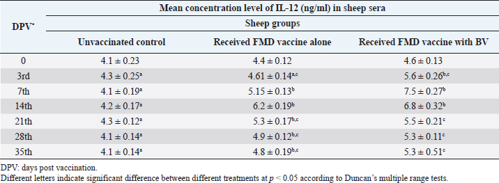 Table 5. Mean concentration of IL-12 (ng/ml) vaccinated sheep.