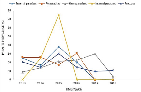 Fig. 1. Yearly prevalence rate of parasites from 2013 to 2018. DiscussionLivestock parasites are common worldwide; the disease burden due to parasites is worse in developing countries (Torgerson and Macpherson, 2011). Financial losses due to weight loss, poor feed utilization, general unthriftiness, and loss of reproduction have been reported (Kumar et al., 2013). In this study, endoparasites were the most reported livestock parasites in Intsika Yethu (75%) and Mbhashe (25%) municipalities. The autumn season (87%) also had the highest prevalence of endoparasites in the 2013–2018 period. The current study’s high prevalence of parasites contradicts Colombian research, where 56.5% of endoparasites was reported (Pinilla León et al., 2019). The reason for these differences might be due to ecological discrepancies in the study geographic areas, poor animal husbandry, lack of understanding of parasite life cycle by farmers, and a general weak primary animal health and herd health programs. A further contributing factor could be the acute shortage of veterinarians in ECP, warranting limited access points for veterinary and extension services across the province (Jaja et al., 2017a). Apart from the unavailability of government established veterinary clinics in most communities, most farmers are ignorant of the need for veterinary health management for their livestock (Onuekwusi, 2014).