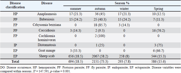 Fly parasites were reported high in the autumn season in Amahlathi and Lukhanji local municipalities. These findings concurred with the report in the study investigating prevalence and distribution of tsetse fly in Nigeria. These studies revealed that fly parasites are more prevalent in areas where the same fly parasites had earlier been eradicated (Oluwafemi, 2012). They show monthly changes in abundance throughout the year and peak in July, one season before the onset of the autumn season (Oluwafemi, 2012). The high prevalence in these regions in ECP could be due to seasonal factors such as altitude and temperature. Also, changing weather patterns, climate variability, and animal movements could shift some parasites and diseases into higher elevations (Scasta, 2015). Although the proportion of protozoa parasites in this study was low, protozoan parasites are a significant cause of abortion and infertility in domestic ruminants resulting in considerable economic losses (Kaltungo and Musa, 2013). Hastutiek et al. (2019) studied protozoa parasites prevalence in low and upland regions and found the highest prevalence (88.23%) in the higher regions. The relatively very low prevalence of protozoa parasites observed in this study could probably be because animals that recovered from some protozoa parasitic diseases might become immune to reinfection (Kaltungo and Musa, 2013). In the present study, the leading hemoparasitic infections were anaplasmosis and babesiosis. Cattle and goats are the most susceptible to hemoparasites, and these parasites cause severe clinical diseases and production losses (Weny et al., 2017). Hemoparasites in the present study were low and widely distributed in many local municipalities and were highest in the autumn season. The low prevalence of hemoparasites in this study is similar to the study conducted in Nigeria investigating the prevalence of hemoparasites in livestock. The Nigerian study recorded a regional prevalence of 38% and a summer prevalence of 64% (Onuekwusi, 2014). The relatively low prevalence of hemoparasitic diseases might be due to underreporting. Also, goats in the study area browse invasive plant species such as Acacia karoo. These plants have been proven as potent anthelminthic agents (Sanhokwe et al., 2016). Communal farmers lack financial resources to cover the veterinary cost (Jaja et al., 2017a). Hence, they make use of ethnoveterinary sources for the management of livestock parasites. In the current study, the prevalence of goat mange was 0.2%. This is in contrast with the findings recorded in the East Harerghe zone (3.4%), Eastern Ethiopia. Mange is a zoonotic parasitic disease caused by mites, which are obligate parasites that affect all warm-blooded animals and man (Anyogu, 2020). It is transmitted through contact with affected animals and or contaminated materials (Zoetis, 2018). Three genera that affect small ruminants include Sarcoptes, Psoroptes, and Demodex. Parasite activities in the host’s skin elicit intense pruritus, which causes a wide range of complications such as mechanical injury from scratching, irritation, dermatitis, and abscess formation due to secondary bacterial infection, weight loss, lameness, anemia, and death in severe cases (Nyangiwe and Horak, 2007). The mange disease is generally seen in animals that are in poor conditions in the pre-summer and summers season (Mana, 2018). Sheep scab is one of the oldest known skin diseases of sheep, and it is caused by either of the mange mites Psoroptes ovis or Sarcoptes scabiei. It is a serious animal welfare condition as parasite activities lead to allergic dermatitis through fecal deposition on the animal’s skin (Dunn et al., 2016). In the present study, sheep scab prevalence rate was 94.5%. This result tallies with a Brazilian study where 66.6%–100% mean intensity of Psoroptes ovis infestation in goats was reported (Amorim et al., 2015). On the contrary, a survey of ectoparasites of goats in the UK only found seven mite and lice infections (Cornall and Wall, 2015). Sheep scab is a controlled disease in terms of the South African Animal Diseases Act of 1984. However, sheep-keeping farmers in the ECP do not fully comply with government regulation on early disease reporting. Sheep scab can only be effectively controlled if all farmers make an effort to obey the law and report incidences timeously. ConclusionThis study found the prevalence of parasitic diseases significantly high in autumn and spring than in summer and winter. Amahlathi, Dr. Beyers Naude, Intsika Yethu, Makana, Mbhashe, and Mhlaba municipalities recorded the highest prevalence of fly parasite, ectoparasite, endoparasite, protozoa disease, and hemoparasitic disease, respectively. On the other hand, Raymond Mhlaba, Lukhanji, Ulundi, Mnquma, Nelson Mandela Bay, and Sakhisizwe municipalities recorded a very low prevalence of parasitic disease. The highest prevalence was reported in 2015 for endoparasites but lowest in 2013, 2016, 2017, and 2018. Parasites are a significant cause of disease and livestock production loss, frequently causing consequential economic loss and affecting animal welfare. Regular and proper use of insecticides, dewormers, and acaricides to control the parasites in ECP is highly recommended an effective preventive or control measures to tame the tides of high parasitic disease prevalence during season active activity. Farmers should be adequately trained on the effective management of animal parasites, acaricides, and veterinary medicines for chemoprophylaxis. Furthermore, strict implementation/enforcement of the South African Animal Disease Act or provision of incentives to farmers who report sheep scabies help to improve the disease reporting system in the study area. Conflict of interestThe authors declare that there is no conflict of interest. ReferencesAmorim, M.G.R. de, Azevedo, S.S. and Riet-Correa, F. 2015. Seasonal prevalence and mean intensity of Psoroptes ovis infestation
