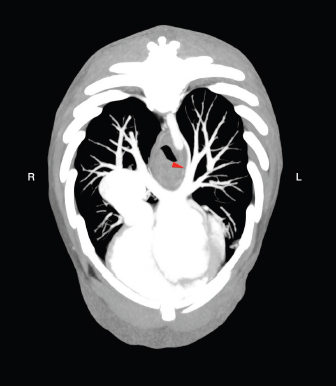 Fig. 2. Transverse MIP view of the venous phase. The red arrowhead indicates the site in which the anomalous vessel enters the lobar vein of the caudal left pulmonary lobe. Conflict of interestNone of the authors of this article has financial or personal relationship with other people or organizations that could inappropriately influence or bias the content of the paper. Authors’ contributionsFederico Puccini Leoni: Conception of the study, study design, collected the data, drafted, revised and approved the submitted manuscript; Andrea Arcangeli: collected the data and revised and approved the submitted manuscript; Riccardo Di Puccio: collected the data and revised and approved the submitted manuscript; Filippo Cinti: Conception of the study, study design, collected the data, drafted, revised and approved the submitted manuscript. ReferencesBertolini, G. 2017. The abdominal vasculature. The liver. In Body MDCT in small animals, 1st ed.. Eds., Bertolini, G. Cham, Switzerland: Springer, pp: 55–125. Boopathy Vijayaraghavan, S., Rao, A.R., Padmashree, G. and Raman, M.L. 2003. Prenatal diagnosis of total anomalous pulmonary venous connection to the portal vein associated with right atrial isomerism. Ultrasound. Obstet. Gynecol. 21, 393–396. D’Anjou, M.A. 2008. Liver. In Atlas of small animal ultrasonography, 1st ed. Eds., Pennick, D. and D’Anjou, M.A. Ames, IO: Blackwell, pp: 234–242. D’Anjou, M.A., Penninck, D., Cornejo, L. and Pibarot, P. 2004. Ultrasonographic diagnosis of portosystemic shunting in dogs and cat. Vet. Radiol. Ultrasound. 45, 424–437. Henseler, K.P., Pozniak, M.A., Lee, F.T. Jr. and Winter 3rd, T.C. 2001. Three-dimensional CT angiography of spontaneous portosystemic shunts. Radiographics. 21, 691–704. Hoey, S.E., Heder, B.L., Hetzel, S.J. and Waller 3rd, K.R. 2016. Use of computed tomography for measurement of kidneys in dogs without renal disease. J. Am. Vet. Med. Assoc. 248, 282–287. Kim, S.E., Giglio, R.F., Reese, D.J., Reese, S.L., Bacon, N.J. and Ellison, G.W. 2013. Comparison of computed tomographic angiography and ultrasonography for the detection and characterization of portosystemic shunts in dogs. Vet. Radiol. Ultrasound. 54, 569–574. Kumar, A., Gonzalez, G., Wilkinson, L., Mohammed T-L., Castro-Pavia, F., Glockner, J. and Kirsch, J. 2010. Computed tomography findings of spontaneous porto-pulmonary shunts in 3 patients with portal hypertension. J. Thorac. Imaging 25, W70–W74. Mankin, K.M. 2015. Current concepts in congenital portosystemic shunts. Vet. Clin. North Am. Small Anim. Pract. 4, 477–487. Szatmari, V. 2013. Vascular disorders. In Canine & feline gastroenterology, 1st ed. Eds., Washabau, R.J. and Day, M.J. St. Louis, MO: Elsevier Saunders, pp: 904–914. Szatmari, V., Rothuizen, J., van den Ingh, T.S., van Sluijs, F. and Voorhout, G. 2004. Ultrasonographic findings in dogs with hyperammonemia: 90 cases (200-2002). J. Am. Vet. Med. Assoc. 224, 717–727. White, R.N., Shales, C. and Parry, A.T. 2017. New perspectives on the development of extrahepatic portosystemic shunts. J. Small Anim. Pract. 58, 669–677. | ||