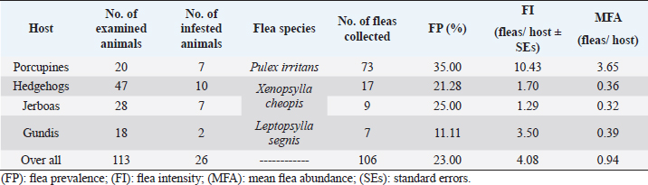 AbstractBackground: Fleas play a major role as vectors for many pathogens that affect humans and livestock. Wild animals, especially wild rodents, are the most important hosts, acting as reservoir hosts for many flea species and pathogens. Aim: This study aimed to identify seasonality and hosts of fleas that parasitize small wild mammals in Gharyan, north-western Libya. Methods: Fleas were collected from seasonally infested hosts from summer 2017 to winter 2018. Results: This survey identified three flea species: Pulex irritans, Xenopsylla cheopis, and Leptopsylla segnis. Pulex irritans was collected from porcupines, X. cheopis from hedgehogs and jerboas, whereas L. segnis from gundis. The highest flea prevalence was in porcupines (35.00%) and the lowest was in gundis (11.11%). The highest intensity was in porcupines (10.43 ± 4.37), and the lowest was in jerboas (1.28 ± 0.24). The highest mean flea abundance was among porcupines of 3.65, whereas in hedgehogs, jerboas and gundis were less than 0.50 flea/host. Pulex irritans was collected during all seasons, while X. cheopis was collected during all seasons except winter, whereas L. segnis was collected only in spring. Conclusion: The finding in this study has increased our awareness that small wild mammals can act as hosts for medically important flea species. All collected flea species have a great specialty in choosing their hosts. Flea intensity is affected by seasonal variations. Keywords: Fleas, Gharyan, Libya, Siphonaptera, Wild mammals. IntroductionMammals, especially rodents, are considered as reservoirs of several pathogens; protozoa, helminths, bacteria, and viruses (Horta et al., 2007); they are infested with ectoparasites which can transmit pathogens (Azad et al., 1997; Perry and Fetherston, 1997; Morick et al., 2011; Iannino et al., 2017). Their ability to adapt to live in urban and rural settings has increased their ability to transmit pathogens to domestic animals and humans (Oliveira et al., 2010). Fleas (Siphonaptera) are highly specialized insects. About 2,575 flea species have been described, and they belong to 16 families and 238 genera (Bitam et al., 2010). Some species are restricted or specialized to certain hosts, while others have a wide host range (Maleki-Ravasan et al., 2017). Over the past decades, dramatic changes have occurred in the geographic distribution and ranges of hosts of vector-borne pathogens; this process is often driven by climate changes and deforestation (Walsh et al., 1993; Gottwalt, 2013). In the last 30 years, deforestation has occurred in Libya, leading to the immigration of wild animals from their environments to areas inhabited by humans. Those animals can carry many fleas and pathogens; therefore, fleas can be transmitted to human dwellings (Hosni and Maghrbi, 2014). Studies of flea diversity, distribution, seasonality, and associated hosts are important for preventing and controlling outbreaks of potential flea-borne pathogens (e.g., plague). Hence, having a good taxonomical knowledge of potential fleas, associated hosts, and seasonality is crucial. There are no comprehensive studies in Libya on flea diversity, seasonality, and their hosts, especially in the Jabal Nafusa region. This study aimed to identify the seasonality and hosts of fleas that parasitize small wild mammals in Gharyan in the north-western part of Libya. Materials and MethodsStudy areaThis survey was carried out from summer 2017 to winter 2018 in Gharyan, which is located on Jabal Nafusa (32.1718° N, 13.0184° E), in the north-western region of Libya (Fig. 1). A great diversity characterizes this region in terms of relief (mountains, hills, and valleys). It is also characterized by seasonal herbs, annuals, and medium-sized plants, such as olive and fig trees. The climate is between the Mediterranean climate and the desert climate. According to Gharyan meteorological station (2017), the mean monthly rainfall is 49 mm, the mean monthly relative humidity is between 15% and 83%, and the temperature ranges from 4ºC to 43ºC. Animal capture and flea collectionSamples of wild mammals were collected seasonally in Gharyan during the study period. Porcupines (Hystrix cristata) and gundis (Ctenodactylus gundi) were captured using 16 live traps baited with bread and a few vegetables. Traps were set in shadow and checked every other day in the early morning, whereas jerboas (Allactaga elater) were caught at night using a net. They were anesthetized with Calmivet® I.M, 3 ml for animals weighing approximately 5 to 7 kg and 1.5 ml for animals weighing less than 5 kg. Hedgehogs (Atelerix algirus) were caught by hand without anesthetization. After collecting fleas, the animals were released into their natural habitat. All fleas were collected from all infested hosts. In the case of hosts whose bodies were covered with hair and lint, fleas were collected using a metal comb (11 teeth per cm), whereas hosts whose bodies were covered with spines, fleas were collected from them by tweezers. Collected fleas were preserved in vials containing 70% ethanol. The samples were taken to the Laboratory of Entomology in Zoology Department, Faculty of Science, University of Tripoli, to mount and identify species levels by using an identification key (Smit, 1957).