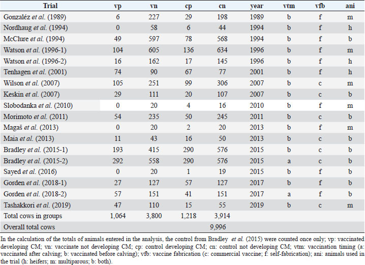 The factor “vaccine fabrication”We have found that commercial vaccines are not effective in preventing mastitis while self-fabricated vaccines show some level of protection. This is a result that apparently does not make sense once the commercial vaccines must have been approved after trials validated by the accreditation authorities. One explanation for this result may again be related to the limitations already identified in our study. Another reason may be the existence of a shadow factor. A plausible reason may be associated with the use of local bacteria in the production of self-fabricated vaccines, determining herd-specific immunity. Ismail (2017) has made a review of studies using commercial vaccines and herd-specific autovaccines and concluded that both types of vaccines produce equivalent results. We have only found one trial (Freick et al., 2016) comparing a commercial vaccine with a herd-specific autovaccine, but no significant differences were found between the two vaccines. ConclusionThis analysis does not provide full clarification of vaccine efficacy. However, if vaccination is to be used, this must follow the pre-calving protocol clearly prescribed by the commercial vaccines. It must also be noted that while not showing efficacy in some trials, the vaccination has demonstrated a reduction in the severity of the clinical disease, rate of culling, and increased the production of milk and milk solids. Organic farming is assuming increasing importance worldwide under the sustainability agenda and, due to the limitations in the use of traditional medication, any additional tool available for the prevention of disease. Therefore, improving welfare should be in the equation. The common preventive measures to control mastitis should not be discarded, and vaccination must be seen as an additional preventive tool in the provision of health and welfare. AcknowledgmentsTo the Foundation for Science and Technology (FCT, Portugal) for financial support to the CISAS UIDB/05937/2020 and UIDP/05937/2020, including the contract of the first author, a postdoc grant of the second author and a PhD grant to third. Conflict of interestThe authors declare that they have no conflict of interest or financial conflicts to disclose. Author contributionsFernando Mata: conceptualization, methodology, data acquisition, quality analysis, statistical analysis, results, writing—original draft. Meirielly S. Jesus: data acquisition, quality analysis, writing—review and editing. Ricardo Pinto: data acquisition, quality analysis, writing—review and editing. Andreia Mata: data acquisition, quality analysis, writing—review and editing. Data availabilityThe dataset used in this meta-analysis is provided within this paper. ReferencesBradley, A.J., Breen, J.E., Payne, B., White, V. and Green, M.J. 2015. An investigation of the efficacy of a polyvalent mastitis vaccine using different vaccination regimens under field conditions in the United Kingdom. J. Dairy Sci. 98, 1706–1720. Burvenich, C., Detilleux, J., Paape, M. and Massart-Leen, A. 2000. Physiological and genetic factors that influence the cows resistance to mastitis, especially during early lactation. In Proceedings of the IDF Symposium on Immune Ruminant Mammary Gland. Ed., Zecconi, A. Stresa, Italy, pp: 9–20. Deeks, J.J., Higgins, J.P.T. and Altman, D.G. (Eds.). 2019. Analysing data and undertaking meta-analyses. In Cochrane handbook for systematic reviews of interventions, 2nd ed. Eds., Higgins, J.P.T., Thomas, J., Chandler, J., Cumpston, M., Li, T., Page, M.J. and Welch, V.A. JJohn Wiley & Sons, Chichester, UK.. Denis, M., Wedlock, D.N., Lacy-Hulbert, S.J., Hillerton, J.E. and Buddle, B.M. 2009. Vaccines against bovine mastitis in the New Zealand context: what is the best way forward? N. Z. Vet. J. 57, 132–140. des Roches, A.D.B., Lussert, A., Faure, M., Herry, V., Rainard, P., Durand, D., Françoise, W. and Foucras, G. 2018. Dairy cows under experimentally-induced Escherichia coli mastitis show negative emotional states assessed through Qualitative Behaviour Assessment. Appl. Anim. Behav. Sci. 206, 1–11. Freick, M., Frank, Y., Steinert, K., Hamedy, A., Passarge, O. and Sobiraj, A. 2016. Mastitis vaccination using a commercial polyvalent vaccine or a herd-specific Staphylococcus aureus vaccine. Results of a controlled field trial on a dairy farm. Tierarztl. Prax. 4, 219–229. Geary, U., Lopez-Villalobos, N., Begley, N., McCoy, F., O’Brien, B., O’Grady, L. and Shalloo, L. 2012. Estimating the effect of mastitis on the profitability of Irish dairy farms. J. Dairy Sci. 95, 3662–3673. Gonzaléz R.B., Cullor, J.S., Jasper, D.E., Farver, T.B., Bushnell, R.B. and Oliver, M.N. 1989. Prevention of clinical coliform mastitis in dairy cows by a mutant Escherichia coli vaccine. Can. J. Vet. Res. 53, 301–305. Gorden, P.J., Kleinhenz, M.D., Ydstie, J.A., Brick, T.A., Slinden, L.M., Peterson, M.P., Straub, D.E. and Burkhardt, D.T. 2018. Efficacy of vaccination with a Klebsiella pneumoniae siderophore receptor protein vaccine for reduction of Klebsiella mastitis in lactating cattle. J. Dairy Sci. 101, 10398–10408. Higgins, J.P.T., Thomas, J., Chandler, J., Cumpston, M., Li, T., Page, M.J. and Welch, V.A. (Eds.). 2019. Cochrane handbook for systematic reviews of interventions, 2nd ed. Chichester, UK: John Wiley & Sons. Hogeveen, H., Steeneveld, W. and Wolf, C.A. 2019. Production diseases reduce the efficiency of dairy production: a review of the results, methods, and approaches regarding the economics of mastitis. Annu. Rev. Resour. Econ. 11, 289–312. International Dairy Federation. 1997. Recommendations for presentation of mastitis-related data. Bulletin No 321/1997, Brussels, Belgium. Ismail, Z.B. 2017. Mastitis vaccines in dairy cows: recent developments and recommendations of application. Vet. World. 10, 1057–1062. Keskin, A., Seyrek-İntas, K., Tek, H.B., Tuna, B., Yilmazbas, G., Ozakin, C. and Ertas, S. 2007. Efficiency of polyv
