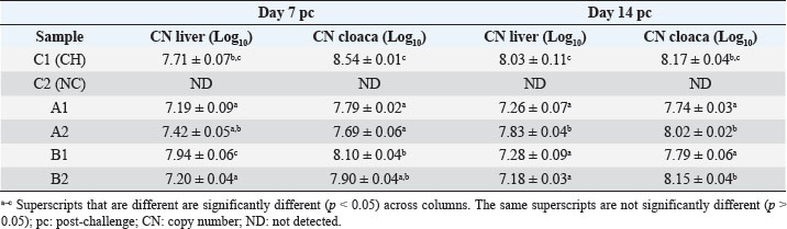 Specificity test for the qPCR primersConventional PCR was performed using FAdV-Hex_143F/R primers (Table 1) for amplification of 166 bp of the FAdV hexon gene. The DNA extracted from the UPM08136P20B1 live attenuated virus and the UPM11142CELP3EP2 challenge virus were used. The amplification conditions were 95°C for 2 minutes 1×, 95°C for 1 minute 35×, 50°C for 1 minute 35×, 72°C for 1 minute, 2 cycles 35× and 72°C for 1 minute 1×. The bands were separated in a 2% agarose gel electrophoresis using a 100 bp DNA ladder at 80 volts for 35 minutes. Standard curveFAdV positive control was used to generate the standard curve. An initial DNA concentration of 100 ng/µl was used and was diluted seven-fold from 100 to 0.0001 ng/µl. Optimization reactions were carried out to determine the best concentration for the primers and probe. The DNA copy number of the positive control was calculated using the formula below (Qiagen, 2014; Fajardo et al., 2017; Prediger, 2017). These dilutions were each amplified in triplicate in a total volume of 20 µl PCR reaction mix containing 10 µl of SensiFAST™ Probe No-ROX Kit (Bioline, London, UK), 0.8 µl of primer pair, 0.2 µl probe, 4.2 µl of nuclease-free water and 4 µl of the template. The non-template control was added in triplicate with nuclease-free water as a template. The qPCR amplification was carried out in CFX96™ Real-Time PCR Detection System (Bio-Rad, USA). The qPCR conditions were initial denaturation at 95°C for 2 minutes, 40 cycles of denaturation, and extension at 95°C for 5 seconds and 60°C for 20 seconds, respectively. qPCR amplification of extracted DNA of the liver and cloacal swab from chickensThe extracted DNA from the liver and cloacal swabs of chickens of each study group were checked for purity and concentration determined by using a spectrophotometer (UV-1601, PC, Shimadzu, Japan). Each pure DNA was used as a template for viral load determination by qPCR amplification with primer and probe as stated in Table 2. The qPCR reaction was carried out in triplicates in a total volume of 20 µl PCR reaction mix containing 10 µl of SensiFAST™ Probe No-ROX Kit (Bioline, London, UK), 0.8 µl of primer pair, 0.2 µl probe, 4.2 µl of nuclease-free water and 1 µl of the template. The non-template control was added in triplicate with nuclease-free water as a template. The qPCR amplification was carried out in CFX96™ Real-Time PCR Detection System (Bio-Rad, USA). The qPCR conditions were as described in the standard curve above. The Cq of each replicate was obtained and used to determine the copy number using a formula, and the average copy number of each sample recorded (Qiagen, 2014). Ethical approvalThis experiment was approved by the Universiti Putra Malaysia Institutional Animal Care and Use Committee and was conducted following international ethical standards. ResultsPrimers, probe, and specificityThe primers showed specificity to the UPM11142CELP5EP2 strain with a band corresponding to 166 bp and a negative band for the attenuated strain (Fig. 1). The primers and probe made use of mismatch positions in the conserved Li loop region of the hexon gene of FAdV 8b to differentiate between the two isolates (Fig. 2). Standard curveWith the aid of known FAdV 8b positive control, a standard curve amplification plot (Fig. 3) and standard curve (Fig. 4) were generated with an efficiency of 96.0%, Regression squared value of 0.997, slope value of 3.422, and y-intercept of 59.387. The plot shows the capacity of this assay to detect FAdV 8b from samples with DNA concentrations as low as 0.001 ng/µl. Detection and quantificationThere was positive FAdV 8b strain UPM11142CELP5EP2 in all the liver and cloacal samples of chickens that were inoculated and no detection among the C2 chickens that were uninoculated (Table 2). This indicates that the challenge virus replicated in the liver of the chickens and was shed in their feces. In the liver, at 7 dpi, the C1 chickens had significantly higher (p < 0.05) FAdV 8b copy number than chickens in A1 and B2 groups. At 14 dpi, the copy number of FAdV 8b in the C1 group was significantly higher (p < 0.05) than that of chickens in the A1, B1, and B2 groups and was higher (p > 0.05) that that of chickens in the A2 group. In the cloaca, at 7 dpi, the FAdV copy number of C1 chickens was significantly higher than that of chickens in the A1, A2, B1, and B2 groups, and at 14 dpi, the C1 group recorded significantly higher (p < 0.05) FAdV 8b copy number than that of A1 and B1, and higher (p > 0.05) than that of chickens in the A2 and B2 groups. Table 2. Copy number of FAdV UPM11142CELP5EP2 in the liver and cloaca of chickens at days 7 and 14 post-challenge.