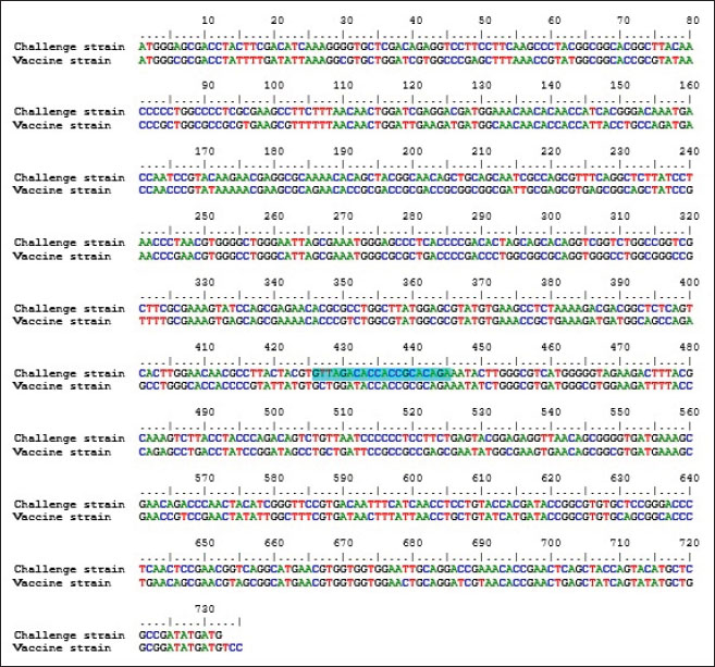 Fig. 2. Sequence alignment of challenge and vaccine strain showing the forward primer in position 426–445 of the challenge virus and not in the vaccine virus. The reaction efficiency in this study was 96% with a regression squared value of 0.997 which is akin to 98% reaction efficiency and regression squared value of 0.999 obtained by Günes et al. (2012) in their SYBR Green-based assay and was higher than the 94.9% efficiency reported by Wang et al. (2017) in their TaqMan probe-based assay for the specific detection of FAdV 4. In this study, the assay was able to detect FAdV 8b inoculum distinct from live attenuated FAdV 8b strain. Similar specificity was reported by Wang et al. (2017) where their assay only detected FAdV 4 (KR5 strain) and could not detect FAdV 10 (C2B strain) which belong to the same species and have nearly identical hexon gene sequences. To our knowledge, this is the first report of a TaqMan probe-based qPCR assay with selective within-serotype FAdV serotype 8b detection. This RT-PCR assay could be useful in the investigative epidemiology of FAdV 8b outbreaks involving vaccinated chickens where the pathogenic virus is of the same or very closely related strain with the vaccine virus and could be modeled for use in other disease outbreaks as well. The Cq values obtained from each sample were within the range of the standard curve, and the amount of FAdV 8b in each sample was determined as the copy number of the FAdV 8b strain.