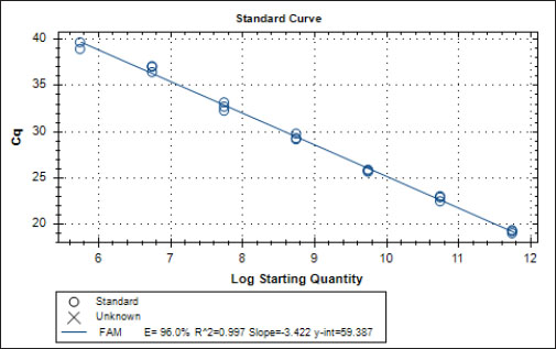 Fig. 4. Standard curve of probe-based qPCR of viral genome copy number in the liver and cloacal swab of chickens infected with FAdV 8b challenge virus. Seven-fold dilution (100–0.0001 ng). The efficiency was 0.96 (96%), and the regression squared value was 0.997. ConclusionThis study reports the development of a probe-based qPCR assay designed to selectively detect the FAdV serotype 8b challenge virus from the liver and cloacal samples obtained from chickens previously inoculated with live attenuated and/or inactivated FAdV 8b and challenged with pathogenic FAdV 8b. The assay successfully detected and quantified the pathogenic strain and not the attenuated strain and could have higher sensitivity than conventional PCR. This assay has proven that selective within-species detection of the virus is possible and could be useful in the future for studying vaccine efficacy against its pathotype and in cases of vaccine failure. It will also be useful in establishing the efficacy of vaccines in reducing viral load in tissues and viral shedding. Author contributionsM.H.B. and A.R.O. conceived and designed the work; M.H.B. secured the funding; C.C.U. executed the experiments; C.C.U., M.I.N., and A.R.O. analyzed the data; C.C.U., M.I.N., A.R.O., and M.H.B. interpreted the data; C.C.U., M.I.N., A.R.O., M.H.B., and A.I. reviewed the manuscript. All authors read the article and agreed to publish the article. Conflicts of interestThe authors declare that there is no conflict of interest. ReferencesAdair, B.M. and Fitzgerald, S.D. 2008. Group 1 adenovirus infections. In Diseases of poultry, 12th ed. Eds., Saif, Y.M., Barners, H.J., Glisson, J.R., Fadly, A.M., McDougald, L.R. and Swayne, D.E. Ames, IA: Iowa State University Press, pp: 260–286. Asthana, M., Chandra, R. and Kumar, R. 2013. Hydropericardium syndrome: current state and future developments. Arch. Virol. 158, 921–931. Calnek, B.W., John Barnes, H., Beard, C.W., Reid, W.M. and H.W. Yoder, Jr. 1991. In Diseases of poultry, 9th ed. Ames, Iowa: Iowa State University Press, pp: 552–563. Choi, K.S., Kye, S.J., Kim, J.Y., Jeon, W.J., Lee, E.K., Park, K.Y. and Sung, H.W. 2012. Epidemiological investigation of outbreaks of fowl adenovirus infection in commercial chickens in Korea. Poult. Sci. 91, 2502–2506. Cowen, B.S. 1992. Inclusion body hepatitis-anaemia and hydropericardium syndromes: aetiology and control. Worlds Poult. Sci. J. 48(3), 247–254. Dar A., Gomis S., Shirley I., Mutwiri G., Brownlie R., Potter A., Gerdts V. and Tikoo S.K. 2012. Pathotypic and molecular characterization of a fowl adenovirus associated with inclusion body hepatitis in Saskatchewan chickens. Avian Dis. 56, 73–81. Fajardo, T.V.M., Vanni, M.F. and Nickel, O. 2017. Absolute quantification of viruses by TaqMan real-time RT-PCR in grapevines. Ciência Rural 47(6); doi:10.1590/0103-8478cr20161063. Gomis, S., Goodhope, A.R., Ojkic, A.D. and Willson, P. 2006. Inclusion body hepatitis as a primary disease in broilers in Saskatchewan, Canada. Avian Dis. 50, 550–555. Günes, A., Marek, A., Grafl, B., Berger, E. and Hess, M. 2012. Real-time PCR assay for universal detection and quantitation of all five species of fowl adenoviruses (FAdV-A to FAdV-E). J. Virol. Methods 183(2), 147–153. Gupta, A., Ahmed, K.A., Ayalew, L.E., Popowich, S., Kurukulasuriya, S., Goonewardene, K., Gunawardana, T., Karunarathna, R., Ojkic, D., Tikoo, S.K., Willson, P. and Gomis, S. 2017. Immunogenicity and protective efficacy of virus-like particles and recombinant fiber proteins in broiler-breeder vaccination against fowl adenovirus (FAdV)-8b. Vaccine 35(20), 2716–2722. Hair-Bejo M. 2005. Inclusion body hepatitis in a flock of commercial broiler chickens. J. Vet. Malaysia 17, 23–26. Hess, M. 2000. Detection and differentiation of avian adenoviruses: a review. Avian Pathol. 29, 195–206. Kajan, G.L., Kecskemeti, S., Harrach, B. and Benko, M. 2013. Molecular typing of fowl adenoviruses, isolated in Hungary recently, reveals high diversity. Vet. Microbiol. 167, 357–363. Kajan, G.L., Sameti, S. and Benkö, M. 2011. Partial sequence of the DNA-dependent DNA polymerase gene of fowl adenoviruses: a reference panel for a general diagnostic PCR in poultry. Acta Vet. Hungarica 59, 279–285. Li, H.Y., Yin, Y.B., Guo, Y.Y., Hu, Y.G., Xu, H.W., Wang, X.H. and Wang, S.C. 2010. Isolation and PCR identification of 12 strains of inclusion body hepatitis virus from clinical broilers. Chinese Vet. Sci. 40, 722–727. Mase, M., Mitake, H., Inoue, T. and Imada, T. 2009. Identification of group I-III avian adenovirus by PCR coupled with direct sequencing of the hexon gene. J. Vet. Med. Sci. 71, 1239–1242. McFerran, J.B. and Smyth, J.A. 2000. Avian adenoviruses. Rev. Sci. Tech. 19, 589–601. Mendelson, C., Nothelfer, H.B. and Monreal, G. 1995. Identification and characterization of an avian adenovirus isolated from a ‘spiking mortality syndrome’ field outbreak in broilers on the Delmarva Peninsula, USA. Avian Pathol. 24, 693–706. Meulemans, G., Boschmans, M., Berg, T.P. and Decaesstecker, M. 2001. Polymerase chain reaction combined with restriction enzyme analysis for detection and differentiation of fowl adenoviruses. Avian Pathol. 30, 655–660. Mittal, D., Jindal, N., Tiwari, A.K. and Khokhar, R.S. 2014. Characterization of fowl adenoviruses associated with hydropericardium syndrome and inclusion body hepatitis in broiler chickens. Virus Dis. 25, 114–119. Mohamed Sohaimi, N., Bejo, M.H., Omar, A.R., Ideris, A. and Mat Isa, N. 2019. Molecular characterization of fowl adenovirus isolates of Malaysia attenuated in chicken embryo liver cells and its pathogenicity and immunogenicity in chickens. PLoS One, 14(12), e0225863; doi:10.1371/journal.pone.0225863. Mullis, K.B. and Faloona, F.A. 1987. Specific synthesis of DNA in vitro via a polymerase-catalyzed chain reaction. Methods Enzymol. 155, 335–350. Mullis, K.B. 1990. The unusual origin of the polymerase chain reaction. Sci. Am. 262(4), 56–61,