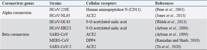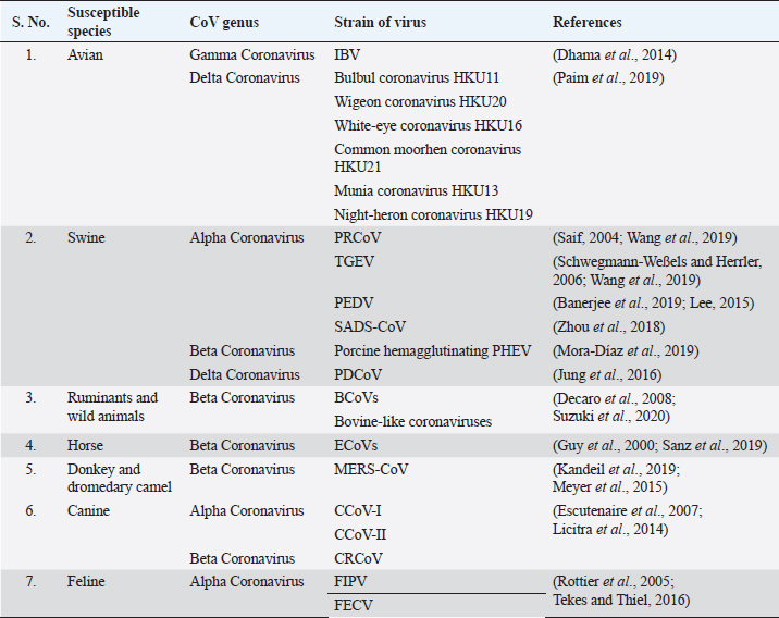 Open Vet. J.. 2020; 10(3): 239-251 doi: 10.4314/ovj.v10i3.1 Open Veterinary Journal, (2020), Vol. 10(3): 239–251 Review Article http://dx.doi.org/10.4314/ovj.v10i3.1 Animal coronaviruses and coronavirus disease 2019: Lesson for One Health approachUddab Poudel1, Deepak Subedi1*, Saurav Pantha1 and Santosh Dhakal21Institute of Agriculture and Animal Science (IAAS), Paklihawa Campus, Tribhuvan University, Siddharthanagar, Nepal 2W. Harry Feinstone Department of Molecular Microbiology and Immunology, Johns Hopkins Bloomberg School of Public Health, Baltimore, Maryland, USA *Corresponding Author: Deepak Subedi. Institute of Agriculture and Animal Science (IAAS), Paklihawa Campus, Tribhuvan University, Siddharthanagar, Nepal. Email: subedideepu26 [at] gmail.com Submitted: 10/06/2020 Accepted: 06/07/2020 Published: 25/07/2020 © 2020 Open Veterinary Journal