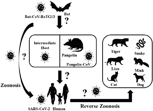 Fig. 1. Possible origin of SARS-CoV-2, and zoonotic and reverse zoonotic transmission possibility. SARS-CoV-2=severe acute respiratory syndrome coronavirus-2; Bat-CoV=bat coronavirus; Pangolin-CoV=pangolin coronavirus. Apart from humans, different wild and domestic animals have been diagnosed with infections. The experimental inoculation of the virus on four rhesus macaques by Bao et al. (2020) showed weight loss by about 200–400 gm, reduced appetite, transient period increased respiration, and hunched posture without change in rectal temperature. In the necropsy of the same experiment, lung lesions, like interstitial pneumonia, alveolar epithelium degeneration, and inflammatory cells infiltration, were observed in HE staining along with opacity of lungs and interstitial markings observed in X-ray 7 days post-inoculation. Panthera tigris, Felis catus, and Canis lupus with ACE2 similarity of 85.70%, 85.22%, and 84.01%, respectively, also showed the infection and clinical signs (Canrong et al., 2020). Although many researches on non-human primates are yet to be carried out, it has been reported by Canrong et al. (2020) that the primates like Gorilla gorilla, Macaca nemestina, Papio Anubis, and Macaca fascicularis have ACE2 similarity of 99.01%, 95.34%, 95.34%, and 95.21%, respectively, when compared to humans. In the same experiment, they found that the free binding energy of SARS-CoV-2 to ACE2, which also defines the affinity of RBD to ACE2, in the above-listed animals is nearly −51.5 KJmol−1 which is very close to free binding energy of SARS-CoV-2 RBD in humans’ACE2 (−50.13 KJmol−1) (Canrong et al., 2020). Considering the very similar ACE2 receptor and close free binding energy of these primates when compared to humans, the possibility of the transmission of SARS-CoV-2 to those primates cannot be overlooked.