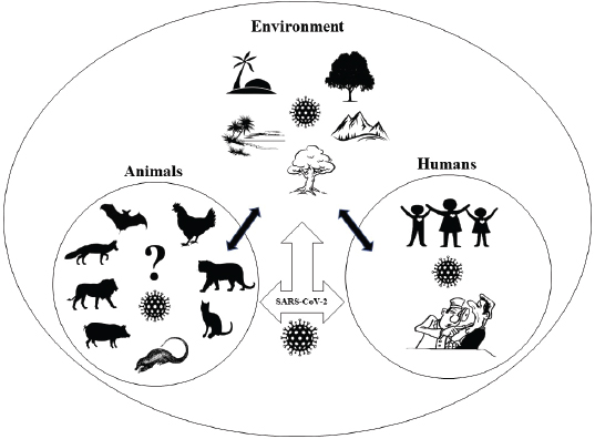 Coronavirus disease 2019 in animalsThe waves of COVID-19 from the Hubei province of Wuhan, China, have caused ripples all around the world and have created havoc with several thousand human deaths and infections across the world except Antarctica. Alongside humans, a number of animals, including dogs and cats (small and large), are also reported to be infected with the disease where transmissions might have occurred from pet owners and zookeepers (Rodriguez-Morales et al., 2020). SARS-CoV-2 has the ability to cross the species barrier, which makes it possible to infect humans, whereas COVID-19-positive humans facilitate the reverse zoonotic transmission of the virus from human to animals (Fig. 1) (Parry, 2020; Zhang et al., 2020b). Among the reported animals, an infected dog did not show any clinical signs, unlike cats. In March 2020, a Pomeranian and later a German Shepherd were found positive for COVID-19 infection in Hong Kong, whose owners were also the victims of the disease (Parry, 2020). The infected cats, wherein the transmission occurred from humans, were from Belgium, Hong Kong, and New York, that got infected in late March and April 2020 showed variations in the degrees of clinical signs, like mild respiratory illnesses (Parry, 2020). A tiger in a zoo in New York was also tested positive for the disease due to the association with a COVID-19-positive zoo employee (Parry, 2020). Positive cases of COVID-19 in domestic cats have also been reported in France, Spain, Germany, and Russia (Parry, 2020). COVID-19 has also been detected in two mink farms in The Netherlands where minks are supposed to transmit CoV to human (CDC, 2020; Yoo and Yoo, 2020). World Organization for Animal Health (OIE) has reported that, so far, there exists no relevant evidence of animal’s role in the spread of the SARS-CoV-2 in the human population (OIE – World Organization for Animal Health, 2020). One Health perspectiveThroughout history, including the current COVID-19 pandemic, human civilizations have been blighted with subtle and impervious emerging and reemerging zoonoses that cost millions of lives and a ruined global economy. The egress and growth of avian and swine influenza viruses, such as Zika virus, Ebola virus, SARS, MERS, and COVID-19, have caused panic around the world and demonstrated how difficult it is to counteract and respond to these changing dynamics of the outbreaks (Streinu-Cercel, 2014; Boeuf et al., 2016; Liu et al., 2020). The emerging diseases are shared between both animals and humans, where about 60% of the emerging pathogens have an animal origin (Jones et al., 2008). Emerging infectious diseases have always been considered as an economic threat, and to prevent the origin and spread of such diseases is of global importance (World Economic Forum, 2010; Morse et al., 2012). Scientists have been warning about the possibility of pandemics, but the world was not prepared in responding to them (Ogawa et al., 2009). Since 1940, more than two-third of the recorded 400 emerging infectious diseases have proved to be zoonotic in nature (Jones et al., 2008; Morse et al., 2012). The close interactions between the people, wildlife, livestock, and favorable environments are one of the major sources of recently emerging infectious diseases, and wildlife accounts for 71.8% of total zoonotic emerging infectious diseases (Caron et al., 2012). Even though the identification and realization of zoonotic diseases are of huge importance, the underlying causes of origin and spread of those diseases have not been given the attention they require (Murray and Daszak, 2013). Veterinarians and epidemiologists have often advocated about the holistic approach of One World One Health to shorten the knowledge gap on disease origin and transmission, but this has not been materialized yet to the extent needed. Animals and humans encounter each other on daily basis in similar ecological conditions for food, safety, companionships, and aesthetic purposes which create an opportunity for the spillover of viruses from their reservoirs (Taylor et al., 2001). It appears very important to constantly maintain the ecological and biological barrier to intervene in the zoonotic transmission of the disease, which is only possible with the ‘One Health’ concept. The recent COVID-19 pandemic is also thought to be the result of such close associations between humans and animals (Fig. 2) (Lorusso et al., 2020). In order to intervene in the transmission chain of the disease, it is extremely crucial to understand the nature of pathogen transmission and identify the range of reservoirs, hosts, and susceptible animals. During the infection, the receptor-binding domain (RBD) of the virus spike protein identifies the angiotensin-converting enzyme 2 (ACE2) of the host tissues mainly in the pneumocytes of lungs, heart, and kidneys (Tai et al., 2020). Therefore, the various species that have ACE2 receptors identical to humans can harbor the disease and get infected. After 96% resemblance of the full-length genome sequence of SARS-CoV-2, obtained from five infected patients, with bat CoV isolate RaTG13, bats were considered as the natural reservoirs (Zhou et al., 2020). It is still the matter of concern if the transmission occurs directly from the bats or there are some intermediate hosts involved (Jin et al., 2020). In the light of research on intermediate hosts, Ji et al. (2020) mentioned the probability of snakes as wildlife animal reservoir based on the relative synonymous codon usage bias. Similarly, Guo et al. (2020), through the introduction of virus host prediction using deep learning algorithm, predicted the infectivity pattern of SARS-CoV-2 and found closeness to minks. Malayan pangolins are the recent discoveries as the intermediate hosts. Pangolin CoVs are believed to be the second closest relative to SARS-CoV-2, after bat CoV RaTG13, with 91.02% identical genome and 97.1% RDB similarity (Zhang et al., 2020a).