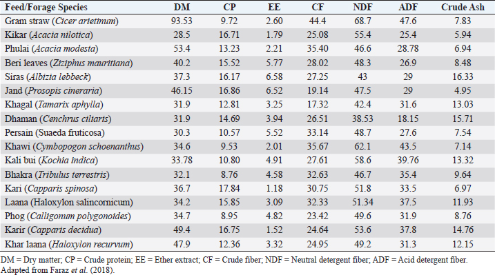 Statistical analysisData collected on different parameters were analyzed statistically by using Fisher’s analysis of variance technique having 2 × 2 factorial arrangements of treatments under completely randomized design (CRD) (Steel et al., 1997) using generalized linear model (GLM) of Statistical Package for the Social Sciences software (SPSS, 2008). Tukey’s test at 0.05 levels of significance was used to compare the differences among the treatment means. Ethical approvalIn the current study, camels were fed according to the farm routine practices having grazing/browsing and stall feeding available. They were provided fresh, clean water and salt loops. Camels were vaccinated and dewormed according to scientific recommendations. All institutional and national guidelines for the care and use of experimental animals were followed (ethical committee approval number: DGS No/19457-62). ResultsCalves of almost similar weights were selected in both management systems for this study. After the 120-day trial period, the overall weight gain and daily weight gain (DWG) (growth rate) were 80.8 ± 2.7, 77.8 ± 2.7 kg and 670, 650 g/days for male and female calves in IMS, respectively, and 64.5 ± 2.6, 52.9 ± 2.6 kg and 540, 440 g/days for male and female calves in EMS, respectively (Table 3). The daily feed intake (DFI) of crop residues was found to vary significantly (p < 0.05) among calf groups between IMS and EMS, with IMS being higher than EMS. The intake of crop residues was found to be 6.9 ± 0.45 and 6.4 ± 0.45 kg/days in male and female calves in IMS, respectively, and 3.5 ± 0.23 for male and female calves in EMS, respectively. The weight gain for 1 kg intake of crop residues in the conversion index is 97.1 and 101.5 g/kg average daily intake (ADI) for males and females in IMS, respectively, and 154.3 and 125.7 g/kg ADI for males and females in EMS, respectively (Table 4). Table 2. Proximate analysis (%) of crop residue and different grazing/browsing species.