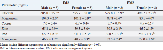 Table 5. Wool mineral analyses of male and female camel calves in IMS and EMS.