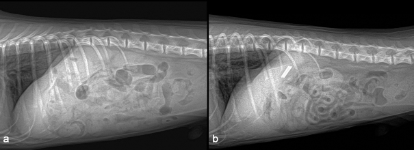 AbstractBackground: Portosystemic shunt and atrial septal defect (ASD) are generally congenital diseases in dogs. Rarely, dogs with congenital vascular anomalies could be related to other vascular anomalies. Case Description: A 1-year-old male Maltese dog, neutered and weighing 1.7 kg, was brought in for an additional assessment of a congenital portosystemic shunt (CPSS). CPSS was diagnosed as portocaval shunt by computed tomography. Surgical attenuation was performed. Although prognosis after CPSS attenuation was good, the dog was presented with exercise intolerance 1 year after the operation. Thoracic radiographs observed generalized cardiomegaly. Echocardiography revealed pulmonary hypertension and right-to-left shunting ASD. Conclusion: The present study reports a rare case of CPSS concurrent with ASD in a dog. As dogs with CPSS might have been associated with other vascular anomalies; therefore, echocardiography is recommended for early diagnosis of other cardiovascular anomalies. Keywords: Atrial septal defect, Dog, Echocardiography, Portosystemic shunt, Pulmonary hypertension. IntroductionCongenital portosystemic shunt (CPSS) is a vascular anomaly that enters systemic circulation through abnormal vascular connections, bypassing the liver. These abnormal conditions can cause various clinical symptoms ranging from gastrointestinal and urinary symptoms to neurological symptoms (Worley and Holt, 2008). Medical treatment for CPSS includes protein-restricted diet, antimicrobial therapy, and treatment with lactulose. Surgical attenuation of the shunt can be performed using an ameroid ring constrictor, a cellophane band, or suture ligation. In general, surgical attenuation shows a better prognosis than medical treatment (Greenhalgh et al., 2010). Atrial septal defect (ASD) is a relatively rare congenital heart defect, accounting for about 3% of all congenital heart defects in dogs. Significant clinical symptoms of ASD include exercise intolerance, cyanosis, and syncope. Nearly half of the dogs with ASD show clinical symptoms, while the other half are asymptomatic (Tidholm, 1997). Medication for dogs with ASD focuses on reducing systemic vascular resistance and venous congestion (Guglielmini et al., 2002). Surgical and interventional treatments for ASD closure are additional options (Sanders et al., 2005; Gordon et al., 2010). Although some dogs with ASD need medical or surgical management, treatment for dogs with minor and uncomplicated defects is usually unnecessary (Guglielmini et al., 2002). When dogs have one congenital vascular anomaly, they might have more than one. A previous study has reported that 11 of 151 dogs have different combinations of congenital heart defects (Tidholm, 1997). However, as a combination of CPSS and ASD was rarely reported in a dog, the purpose of the present study was to describe a case of CPSS concurrent with ASD in a Maltese dog. Case DetailsA 1-year-old neutered male Maltese dog weighing 1.4 kg was referred to the Veterinary Teaching Hospital showing microhepatica (Fig. 1a) and hyperammonemia. The dog did not show clinical signs related to portosystemic shunt previously. Although its postprandial ammonia level was in the reference range [18 μmol/l, reference interval (RI): 0–98 μmol/l], hypoalbuminemia (2.1 g/dl, RI: 2.6–3.3 g/dl) and increased levels of serum bile acid (177 μmol/l, RI: 0–25 μmol/l), alanine transaminase (ALT) (254 IU/l, RI: 21–102 IU/l), and alkaline phosphatase (ALP) (1347 IU/l, RI: 29–97 IU/l) were identified. No abnormalities, including cardiac murmur, were observed during physical examination. For a more thorough examination, computed tomography was used, and a CPSS (porto-caval shunt) was diagnosed (Fig. 2a and b). After preoperative medical stabilization, surgery was performed for shunt attenuation. Anesthesia was induced with propofol (8 mg/kg, IV) and maintained by isoflurane. Perioperative pain was managed by tramadol (5 mg/kg, IV). From the xiphoid process to the pubis, a standard ventral midline approach was taken. After dissecting the shunt from surrounding tissues, portal pressure was measured from the jejunal vein. Baseline portal pressure was measured to be approximately 7–8 mmHg (RI: 6–10 mmHg). It increased to 13–14 mmHg after temporary complete occlusion of the shunt. The shunt was attenuated using a cellophane band. The abdominal cavity was closed in a routine manner. Its recovery from anesthesia was uneventful. Postprandial serum bile acid (12 μmol/l), albumin (2.6 g/dl), and ALT (29 IU/l) levels returned to their normal ranges at 1 month after the operation. Its serum ALP level also decreased to 430 IU/l, although it was above the RI. An increase in liver size was observed by abdominal radiographs 1 month after surgery (Fig. 1b). Because the majority of the CPSS anomalies were cured throughout the follow-up period, the dog was able to return to normal life without the need for supporting medicine. One year after surgery, the dog was presented to the Veterinary Teaching Hospital for exercise intolerance. Blood gas analysis revealed hypoxemia (73.6%, RI: 95%–99%). A cardiac murmur was auscultated. When compared with thoracic radiographs evaluated at the time of the operation (Fig. 3a and b), the vertebral heart scale increased from 10 to 11.7, indicating generalized cardiomegaly (Fig. 3c and d). Following echocardiography revealed ASD and pulmonary hypertension (Fig. 4a and b). A bubble study confirmed right-to-left shunt. Surgical or interventional therapy was not contemplated due to the dog's tiny size (1.7 kg) and reversed interatrial shunt. Thus, medical treatment was performed to reduce pulmonary hypertension (sildenafil, 1.5 mg/kg, PO, q12 hours). Hypoxemia was improved (94%) after a month of treatment. The dog's activity intolerance had been overcome, according to the owner. As a response to the medical treatment was generally good, therapy was still maintained without changing medication