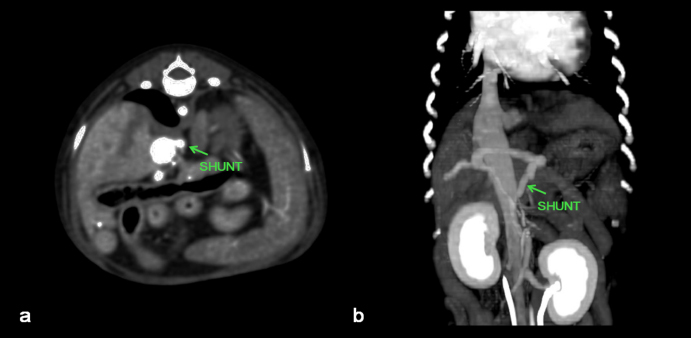 Fig. 2. Cross (a) and sagittal (b) views of CT images showing a congenital extrahepatic portosystemic shunt.