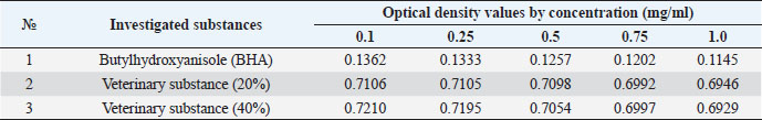 The ARA of the investigated substances was compared with the ARA of butylhydroxyanisole (BHA). The values of the antiradical effect of substances, calculated by the formula (2), are given in Table 4. Based on the analysis of the data from Tables 5–7 and Figure 1, it is evident that 20% and 40% of veterinary substances have low ARA compared to BHA. Based on the experiment conducted, it can be assumed that the resulting composition (40%) does not exhibit cytotoxicity in all tested concentrations. The larvae remained alive, but their activity was significantly inhibited. The next stage in the study of the obtained drug was the study of pharmacotherapeutic activity in the treatment of subclinical mastitis in dairy cattle. The study of milk samples for the detection of a subclinical form of bovine mastitis during the interlactation period, as well as the prophylactic and therapeutic efficacy of the drug, was carried out according to standard methods—sampling for a somatic test, sampling for a Lange test, and a sedimentation test. In order to determine the therapeutic dose of the drug, two groups of animals with a subclinical form of mastitis, five animals in each, were selected. At the same time, the animals from the first group were injected with the drug “Mastometrin” at a dose of 5 ml, the animals from the second group were injected with the obtained substance at a dose of 5 ml. The mammary glands of animals of both groups were exposed to the “Aquaton” apparatus with an exposure time of 15 minutes. Clinical observation of the animals (BT, pulse, and respiration rate) was conducted daily for 6 days. A comparative treatment regimen for bovine mastitis is presented in Table 8. As a result of the therapeutic measures, it was found that cows with subclinical mastitis showed recovery at different times (Table 9). Thus, in the animals of the second experimental group, the inflammatory processes in the lacteous gland decreased much earlier than in the animals of the first experimental group. Table 3. Change in optical density of the investigated substances with change in concentration.