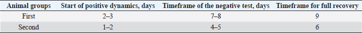 Also, studies were carried out to assess the physical and chemical parameters of milk from contaminated cattle. Organoleptic testing has shown that the milk of healthy animals was white, without any foreign smell or taste. In the results of the physical and chemical studies, the following data were obtained, which are presented in Table 10. DiscussionFrom the analysis of the above, it follows that in the group of contaminated animals, an increase in total milk protein is observed by 0.16% due to an increase in the content of whey proteins, with a simultaneous decrease in casein, respectively, by 2.65%. The increase in the content of whey proteins was caused by lactoglobulins and immunoglobulins in milk. This is apparently associated with inflammatory processes in the genitals and, as a consequence, with an increase in the concentration of immunoglobulins in the blood. In cows with mastitis, a decrease in the content of fat, lactose, calcium, and phosphorus was observed with a simultaneous increase in the content of total and whey milk proteins, catalase activity, and also changes in the technological properties of milk, a decrease in its buffer capacity. Changes in the content of proteins, and fats lead to a decrease in the energy value of milk. Belkin et al. (2015) devoted a number of studies to the research of bovine mastitis as the most important scientific and practical problem of veterinary hygiene and obstetrics. Being a polymicrobial and multifactorial disease, inflammation of the lacteous gland—mastitis, is widespread in cows on farms and complexes. Along with summarizing the most important literature data, the papers give special attention to the results of scientific developments and research by the authors in the field of creation and application in practice of new methods for the diagnosis and treatment of bovine mastitis. Mestorino and Errecalde (2011) believe that bovine mastitis is a disease characterized by significant economic losses due to a decrease in milk secretion, a potential decrease in cow productivity, and an increase in production costs due to contamination of milk with microorganisms. Intramammary infection is the most common cause of mastitis in dairy cows. Antimicrobial drugs have been used to treat mastitis for over 50 years, but there is still no consensus on the most effective, safest, and most economical treatment. Belkin et al. (2009) developed a new treatment for bovine mastitis in interlactation period using antimicrobial drug apramycin in combination with xanthan gum. Table 9. Dynamics of cow recovery.