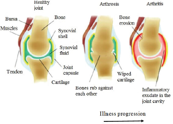 Fig. 2. Development of arthritis. Bornes et al. (2018) studied the effects of oxygen concentration on the regenerative potential of MSCs-BM differentiated in the chondrogen direction. At the same time, native MSCs-BM was grown on scaffolds (cell matrices) made of hyaluronic acid. Before transplantation, MSCs were injected into the damaged joint and then placed in a differentiation medium and cultured at 21% oxygen (normoxia) or 3% (hypoxia) for 4 days. Cells were not transplanted into animals in the control group having damaged joints. According to the results obtained from the experiments, the researchers concluded that when cells were cultured in vitro in a chondrogenic environment in hypoxic samples, the expression of aggrecan and type 2 of collagen increased. However, after in vivo implantation, the difference between normoxic and hypoxic samples on histological morphology was not detected, but in comparison with acellular controls in the two experimental groups, there were higher percentages of filling within injuries with a hyaline-like tissue (Bornes et al., 2018). Abdalmula et al. (2017) studied the regenerative potential of MSCs which were obtained from the ovary of a sheep on a model of sheep monoarthritis. They received collagen-induced hock monoarthritis of the joint, and then animals were given intravenous MSCs derived from ovarian mesenchyma. As a result of the experiments, a positive regenerative effect of the selected MSCs was shown. The publication notes significant reductions in lameness, pain in the affected joints, and edema as compared to the animals in the control group. Besides, histological studies showed decreased cartilage erosion in the experimental group along with activation of the synovial stromal cells and angiogenesis. These effects were accompanied by a decrease in the infiltration of synovial tissues by CD4 + lymphocytes and CD14 + monocytes/macrophages. Within 3 days of induction in the MSCs injected in articular arthropathy animals, a significant decrease in the numbers of circulating neutrophils in the blood and the concentration of activin A in the blood plasma was observed. From the results obtained, it was concluded that MSCs isolated from the ovaries can soften the clinical signs of arthritis and reduce the concentration of certain inflammatory mediators in the blood responsible for the destruction of joint tissue (Abdalmula et al., 2017). In a model of medial condyle defect of the femoral bone and trochlear notch in goats, MSCs-AT therapy and stromal vascular fraction (SVF) were used. The cells were seeded on a type I/III collagen scaffold and transplanted into animals. This procedure led to stimulation and regeneration of cartilage compared to animals treated with scaffolds of cell-free collagen I/III. The researchers reported that there were no significant differences in the rate of regeneration between animals that received a collagen scaffold with MSCs-AT or SVF (Jurgens et al., 2013). Regenerative therapy of cartilage injury in dogs by MSCs transplantationIn contrast to most studies in goats and sheep, dogs are not only used as model animals in preclinical research when developing MSCs therapies, but also as species-specific treatments which are being developed for their own healthcare needs (Kazemi et al., 2017). Kazemi et al. (2017) conducted a series of experiments on 12 adult dogs in which osteochondral defects were created on the medial condyles of the femoral bone, into which MSCs-BM mixed with a thrombocyte mass were placed. In control animals, the defect was not filled in. According to the results of the experiment, the use of autologous cultures of MSCs-BM with thrombocyte masses stimulated cartilage regeneration in dogs. Thrombocyte masses are rich with fibrin and create a suitable environment for proliferation and differentiation of MSCs by releasing endogenous growth factors that lead to the creation of hyaline-like reparative tissue (Kazemi et al., 2017). The treatment of nine dogs with natural OA on the background of joint dysplasia also showed interesting results. The animals had not received any treatment for 2 months prior to a single intra-articular injection of autologous MSCs-AT. Observations noted over the ensuing 6 months showed that lameness and severe pain disappeared for 3 months, but thereafter the symptoms of the disease began to reappear (Vilar et al., 2014). However, studies conducted by Shah et al. (2018) have shown a positive effect of intravenous or intra-articular administration of MSCs in dogs with natural degenerative arthritis. Of the 203 dogs treated, 88% had a significant reduction in clinical symptoms, while the remaining 12% had no reaction following cell administration. At the same time, it should be noted that the positive effects of the introduced MSCs-AT also correlated with the age of the animals. Significant improvements occurred in 90% of the younger dogs (up to 9 years old), which reduced to 60% of older dogs (Shah et al., 2018). Intra-articular introduction of allogeneic MSCs in 0.5% hyaluronic acid to dogs suffering from elbow joint dysplasia and OA showed significant improvements in the condition of animals. Researchers noted the absence of lameness or reduction to just low-grade lameness for 1 year. Control arthroscopy of the first group of dogs with the absence of lameness showed that the cartilage was restored. Histological analyses of the cartilage biopsy also confirmed that the regenerated cartilage was of the hyaline type. These results demonstrate that allogeneic MSCs-AT transplantation is a new, non-invasive, and highly effective therapeutic tool in the treatment of canine dysplasia of the elbow joint (Kriston-Pal et al., 2017). The influence of species-specific MSCs umbilical cords of dogs was studied in animals with naturally occurring OA in the elbow joint. The presence of changes in the dog’s joint following treatment was confirmed by computer tomography. After collecting CB fr