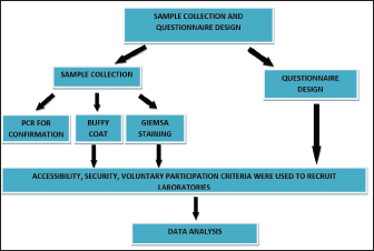 AbstractBackground: Due to its affordability in disease-affected communities and suitability for field application, microscopy has historically been considered the gold standard for field diagnosis of trypanosomosis in rural settings. Aim: This works aims to compare the performance of microscopists on bovine trypanosome microscopy by organizing the first comparative assessment on a correct reading of slides by laboratory professionals using the read slide results and a structured interviewer-administered questionnaire in North-central Nigeria. Methods: Ten participants were addressed, as they were sent a panel of two slides (Slide 1: No Trypanosome present; Slide 2: Trypanosome present) and a questionnaire. Results: All participants greater than 41 years old reported correctly the presence and absence of parasites on slides. Only 3/8 of microscopists from routine diagnostic laboratories reported correctly the presence of the parasite. Conclusion: Our study confirmed errors in reading slides. Therefore, training of microscopists besides a nationwide quality assessment is recommended. Keywords: Blood film microscopy, Bovine trypanosomosis, North-central Nigeria, Performance, Evaluation. IntroductionTrypanosomosis is considered the most important constraint to the health and improved productivity of cattle in sub-Saharan Africa (Taylor, 1998). It is ranked among the most important genera of hemoparasites of veterinary importance affecting cattle (Bakre et al., 2020). The disease is characterized by fever, anemia, reduced productivity, and frequently high mortality, which among the other factors limit the development of rural areas in tropical Africa (Abenga et al., 2002; Fajinmi et al., 2007). As of 2011, the annual financial burden of animal trypanosomosis in Nigeria was estimated to be above 22 million dollars (Fadiga et al., 2013). In the southern states, African animal trypanosomosis (AAT) prevalence values ranged between 2.7% and 35.45% (Opasina and Ekwuruke, 1987; Unigwe et al., 2022). In northern states, trypanosome prevalence using microscopy is 0.8% in Bagudo local government of Kebbi state (Yusuf et al., 2015), 26.67% in Song local government of Adamawa state (Zubairu et al., 2013), 2.2% in Kaduna central (Samdi et al., 2011), and 1.8% in Sokoto main abattoir (Fajinmi et al., 2011). Similarly, prevalence rates of 8.4% (Enwezor et al., 2009) and 3.98% (Machina et al., 2017) have all been reported in Kaduna state. Trypanosoma vivax is reported to be the dominant species in ruminants in most parts of northern Nigeria (Omotainse et al., 2004). AAT is being controlled by chemotherapy or targeting the tsetse fly (Steverding, 2008). However, the effect of PATTEC Nigeria, which was officially inaugurated at the 26th ISCTRC conference in 2001 on trypanosomosis and tsetse elimination, is not yet felt among local farmers considering the financial limitations (Odeniran, 2022). Diagnosis is an essential element in disease’s management among animal populations. Microscopy-based techniques using direct observation of wet blood films, buffy coat technique (BCT) (Murray et al., 1977), or hematocrit centrifugation technique (Woo, 1970) are the most common methods of parasite detection. Although its main drawbacks reflect in its analytical sensitivity (low analytical sensitivity in chronic infection and nil in healthy carriers), microscopy is the ideal diagnostic technique for bovine trypanosomosis because it is suitable for field application and has test cost within the means of the communities affected by the disease (Hailu, 2019; Desquesnes et al., 2022). For this reason, microscopy has historically been considered the gold standard for field diagnosis in rural settings. In rural areas, the quality of microscopy in trypanosomosis endemic areas is often inadequate because of poor quality equipment, insufficient training, and lack of quality assurance (Rosenblatt et al., 2009; Moura et al., 2014). External quality assessment (EQA) is a quality assurance method for objectively checking the laboratory’s performance through panel testing, blinded rechecking of slides, and on-site supervision. Studies by Mukadi et al. (2013) showed that EQA methods were feasible and acceptable to improve the quality of blood film microscopy. In 2002, the World Health Organization (WHO) launched an EQA program to improve the proficiency of microbiological testing for diseases prone to cause epidemics in the WHO Africa Region (Frean et al., 2012). The first and second national large-scale EQAs on trypanosomosis were done in humans in The Democratic Republic of the Congo (Mukadi et al., 2011, 2016). However, such assessments have not focused on the microscopy-based diagnosis of diseases of economic importance in animals. Hence, this study aims to assess the ability of microscopists to detect and identify Trypanosoma brucei in infected cattle and point out quality improvement areas in microscopic diagnosis for effective case management and control of the disease. Materials and MethodsStudy designBetween July and October 2021, 10 clinical laboratories in the country’s North-central part of Nigeria were contacted. Laboratories were recruited from both public and private sectors, and this was based on accessibility, security, and voluntary participation. Collected samples were analyzed in the laboratory using two different methods [microscopy and polymerase chain reaction (PCR) for confirmation]. Slides were read by two microscopists using Olympus Microscope CX23 (Japan), questionnaires responses were recorded, and all data was analyzed (Fig. 1). Sample collectionUsing the ear and jugular vein of each of the five cattle used for the study, the demonstration of the presence of T. brucei was done using a buffy coat (Woo, 1970) and the Giemsa staining method (Wilson, 1969). To maintain quality, slides were prepared, viewed, and double-checked by two professional microscopists before it was sent out to the participating lab