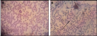Fig. 2. (A) Uninfected sample. (B) Trypanosoma brucei (arrowed) infected sample. Statistical analysisData were entered into Excel spreadsheets (Microsoft, Redmond, USA) and analyzed using Stata version 10.0 (StataCorp. LP, College Station, TX, USA). Ethical approvalEthical clearance for the present study was obtained from the Ahmadu Bello University Committee on Animal Use and Care (ABUCAUC) of Ahmadu Bello University; Ref: ABUCAUC/2019/26. The purpose of the study was explained to the participants and consent was obtained before responding to the questions on the survey. ResultsA total of 10 laboratory professionals took part in the study. All microscopists responded to the microscopy request, and the questionnaire was submitted. More males (6/10) than females took part in the study. The educational qualifications of the microscopists were a diploma (8/10) and a degree (2/10). All respondents greater than 41 years old reported correctly the presence and absence of parasites on slides. Similarly, microscopists who had university degrees reported correctly the presence and absence of parasites (Table 1). The type of diagnostic laboratories that took part in the study were routine diagnostic laboratories (8/10) and research laboratories (2/10). For trypanosome diagnosis, microscopists reported using only thin blood film (7/10) and buffy coat (3/10). For slide 2, only 3/8 of microscopists from a routine diagnostic laboratory reported correctly the presence of trypanosome. Among the 3/10 that reported using BCT for trypanosome diagnosis, 2/3 reported correctly the presence of the parasite. A total of 7/10 reported having received training on microscopy, among which only 3/10 were trained in the last 5 years (Table 2). DiscussionThe present study assesses the ability of some microscopists in North-central Nigeria to detect and diagnose bovine trypanosomosis. Table 1. Demography and performance of laboratory professionals on trypanosome microscopy in the selected diagnostic laboratories in Gwagwalada Area Council, Federal Capital Territory, Abuja.