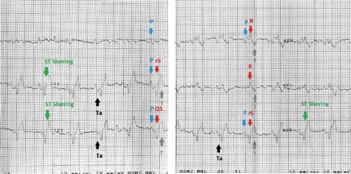 Finally, this study has three main limitations: a low number of subjects enrolled and a recording speed of the ECG tracks at 50 mm/second instead of 100 mm/second more suitable for such high heart rates.