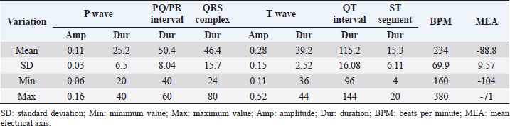 The mean heart rate was calculated by the average of 10 consecutive RR intervals. The morphologic patterns of P, QRS, and T waves were evaluated for each lead and the QRS were labeled according to the standard nomenclature. The major deflection was indicated by a capital letter and the minor deflections by lower case letters (Tilley, 1994; Smith et al., 2015). The lead II was selected to measure amplitude and duration of P, T waves, and QRS complex, as well as the duration of PQ/PR, QT intervals, and ST segments. The mean electrical axis (MEA) in the frontal plane was determined in leads II and III using the Bailey hexaxial method (Tilley, 1994; Smith et al., 2015).