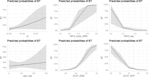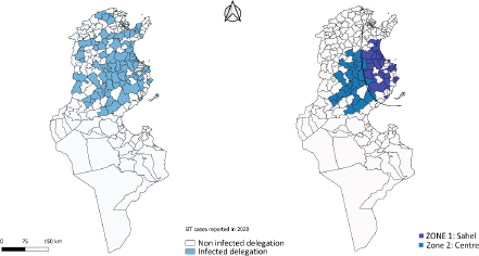 AbstractBackground: Bluetongue (BT) is an important infectious, non-contagious, OIE-listed viral disease of domestic and wild ruminants. The disease is transmitted among susceptible animals by a few species of an insect vector in the genus Culicoides. Recently, during the fall of 2020 (September and October), a Bluetongue virus-4 epizootic marked the epidemiological situation in several delegations of Tunisia with clinical cases recorded in sheep and cattle. Aim: Determine the eco-climatic variables most likely associated with delegations reporting BT cases. Methods: A logistic regression model (LRM) was used to examine which eco-climatic variables were most likely associated with delegations reporting BT cases. Results: Based on the LRM, our findings demonstrated that the key factors contributing significantly to BT cases’ distribution among delegations in Tunisia included day land surface temperatures (DLST), night land surface temperatures (NLST) and normalized difference vegetation index (NDVI). A positive correlation between sheep distribution and rainfall amounts was demonstrated. Statistical analysis focusing on the most affected delegations during the BT epidemic (the Sahel and the Centre of Tunisia) demonstrated that the epidemic situation seems to be a consequence of the combination of the following environmental parameters: NDVI with values ranging between 0.16 and 0.2, moderate rainfall 2–4-fold above the normal (10–50 mm) and DLST values between 32°C and 34°C in September. Conclusion: These findings suggest and develop a robust and efficient early warning surveillance program in risk areas based on eco-climatic risk factors. Keywords: Bluetongue, Tunisia, Eco-climatic factors, Logistic-regression-analysis. IntroductionBluetongue (BT), an emerging and re-emerging vector-borne disease (VBD) transmitted by insect vector species of the genus Culicoides, is caused by different serotypes of non-enveloped double-stranded RNA viruses in the Orbivirus genus of the Reoviridae family. Infection with Bluetongue virus (BTV) is reported in wild and domestic ruminants and can generate serious economic consequences (Talavera et al., 2015; Ben Hassine et al., 2017; Hassani et al., 2020). In addition to the 24 well-known serotypes of BTV, other atypical novels BTV serotypes have been described and reported throughout the world (Schulz et al., 2008; Rupner et al., 2020). The principal insect vector of BT in Tunisia is Culicoides imicola (C. imicola) (Hammami, 2004; Hammami et al., 2008; Sghaier et al., 2009, 2014). Other species of Culicoides, such as C. obsoletus, C. newsteadi, C. punctatus, and C. kingi, have been shown to transmit BTV in other parts of the world. Although these species have been identified in Tunisia, their possible role in BT transmission is unclear yet (Sghaier et al., 2017). Since the first detection of BT serotype 2 in Tunisia in 1999 (Ben Fredj et al., 2003; Hammami, 2004), many incursions have been reported; BTV-1 in 2006 and BTV-4 in 2009 (Lorusso et al., 2012, Sghaier et al., 2014). In 2016, a novel BT serotype 3 was reported (Lorusso et al., 2018). In 2018 and 2019, the resurgence of BTV-2 and BTV-4 were reported, respectively, to the World Organization of Animal Health (OIE-Wahis, 2021). Recently, in September and October 2020, the epidemiological situation was marked by the re-emergence of BTV-4. Many clinical cases were reported in sheep and cattle. The most affected areas are localized in the Sahel and the Centre of Tunisia, with over 80% reported cases. BT outbreaks were highly seasonal. They occur during the late summer and autumn, closely related to climatic and ecological factors, which influence the abundance and survival of the vectors.These factors include temperature (Wittman et al., 2002), vegetation index (Carpenter et al., 2009), relative humidity (Carpenter et al., 2009; Kumar et al., 2018), wind speeds (Ducheyne et al., 2007; Carpenter et al., 2008; Baylis et al., 2010), higher rainfall in the preceding month of the occurrence of the disease (Gloster et al., 2008; Eticha and Mekonne, 2019), elevation (Hendrickx et al., 2008; Guis et al., 2012), livestock distribution (Van Schaik et al., 2008; Jacquot et al., 2017) and soil types (Purse et al., 2004). There are many dynamic climate zones in Tunisia with different agriculture practices and livestock distribution among regions.To design interventions to limit the spread of BT, it is essential to identify these factors and determine their importance in spatial disease spread. Due to the complexity involved in determining BTV and other VBD transmission, scientists often use mathematical modelling to understand the transmission dynamics of these diseases (Gubbins et al., 2007; Turner et al., 2013; Brand et al., 2016). Spatial analytical tools have created an opportunity to evaluate environmental variables generated by remote sensing satellite sensors and analyzed by Geographic Information Systems (Tanser and Le Sueur, 2002; Vinodh Kumar et al., 2016). These technologies provide useful tools for identifying and quantifying areas at high risk for viruses’ circulation and spread. This study aimed to investigate eco-climatic variables associated with BTV incursions in Tunisia, which may subsequently provide useful information for developing an early warning system and the development of effective prevention and control strategies forthe disease. Materials and MethodsStudy area and data collectionIn the first phase of the study, the whole Tunisian territory was considered for the logistic regression analysis model. The administrative structure of Tunisia is composed of governorates, delegations and imadats.The delegation was chosen as the epidemiological unit and classified as an infected or non-infected delegation (Fig. 1). As of 2018, 24 governorates in Tunisia were divided into 264 delegations. Information about infected delegations was obtained from the Veterinary Research Institute of Tunisia a