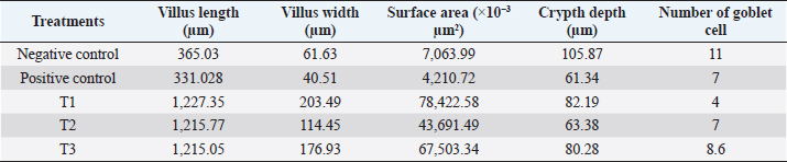 Fig. 1. (a) Negative control. In the ileal organs appear normal villi (V) (black arrow) (100x magnification). (b) Negative control. In the ileum organ appear normal goblet cells (white arrow) of epithelial regular arrangement. Histopathology observationThis study showed that compared to the negative control and treatment groups T1 and T2 (Figs. 1b, 3b and 4b), the positive control group (chickens infected with S. enteritidis bacteria) and T3 had erosions in the ileum (Figs. 2b and 5b). The negative control and treatment groups T1 and T2 showed normal epithelial arrangement with elongated villi (Figs. 1a, 3a, and 4a), and many goblet cells (Figs. 1b, 3b, and 4b). While in the T3 treatment group, we observed epithelial erosion and short vili resembling that of positive control treatment (Figs. 2a and 5a). The intestinal villi’s ability to absorb nutrients can be examined using morphometric calculations, including villi height (VH), villi width (VW), villus surface area, and the crypt depths. Villus morphometry can be observed using an Olympus microscope equipped with an X21 projector (camera) OptiLab and arranged with a magnification of 40 times. Villus heights are measured from the tip of the villi to the base, excluding crypts, and villus widths are measured halfway between the villus base and the tip, and the crypt depths are measured from the villus base upward to the region of transition between the crypt and villus (Hossain et al., 2014). According to the research conducted by Moghaddam and Alizadeh-Ghamsari (2013), the villus surface areas are calculated using the formula: 2 × 3.14 × (VW/2) × VH. DiscussionThe MDA levels (nmol/l) of the chicks in the negative control (C1) group (healthy chickens) were lower in the sick chicks [positive control (C2)]. MDA is a secondary lipid peroxidation product that acts as a marker to indicate the level of lipid oxidation. It can also act as a second messenger or react directly with biomolecules to disrupt biochemical processes (Lobo et al., 2010). MDA reacts with DNA to cause DNA damage. Lipid peroxidation refers to oxidative lipid degradation. It usually affects polyunsaturated fatty acids because they contain multiple double bonds between the methylene bridges (−CH2−), which have a reactive hydrogen. Salmonella enteritidis bacteria can produce high MDA concentrations and cause oxidative damage (Afshordi et al., 2016). Oxidative damage to membranes changes the degree of membrane fluidity, which can cause impaired membrane integrity, inactivation of membrane-bound receptors and enzymes, thus impairing normal cellular function, and increasing tissue permeability. Furthermore, lipid peroxidation’s final product can act as a “second cytotoxic messenger” to induce cell damage. Some of these products readily react with various biomolecules, including proteins, DNA, and phospholipids, to produce a stable product at the end of the reaction series thought to contribute to the disease’s pathogenesis (Aprioku, 2013).