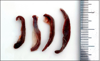 Fig. 1. Photograph illustrates the spleen of a hamster which’s an elongated lanciform-like shape. The microscopic observations found that a capsule of two layers surrounds the spleen: the outer serosal layer comprised of peritoneal mesothelium (mesothelial cells) and the inner subserosal layer composed of irregular dense connective tissue interfused with elastic and smooth muscle fibers. the thickness means of the capsule was (22.41 ± 0.51 µm) (Table 2). The inner layer of the capsule extends deep to form the trabecula, which irregularly subdivides the splenic parenchyma; the trabeculae are constituted of; collagen fibers bundles of elastic and smooth muscle fibers (Fig. 2). The large trabecula provides lanes of pathways for arteries and veins to pass into the spleen (Fig. 3). The mean thickness of trabeculae was (26.58 ± 1.20 µm) (Table 2). The splenic arteries and veins were primarily noticeable and situated within the vascular sheath of the splenic hilus, surrounded with connective and adipose tissue and filled with erythrocytes (Fig. 4). The splenic parenchyma was composed of; red pulp and white pulp. The red pulp was the predominant portion of the parenchyma, which was a branched network of reticular tissue, lymphocytes, neutrophils, macrophages, mast cells, and hemosiderin deposition (Fig. 5); the different types of splenic cells identified according to the cell structure, cell size, nucleus shape, and the presence of cytoplasmic granules and cytoplasmic extensions, the cells arranged to form channel-like cellular cords (splenic cords), these cords surrounding large venous sinusoids (splenic sinusoids). The parenchyma demonstrates a considerable level of mitotic activity, as evidenced by the significant number of mitotic figures present upon examination (Fig. 6); the average diameter of the splenic sinusoids was (13.89 ± 0.82 µm) (Table 2). While the white pulp was composed of small, spherical lymphatic follicles of about 4–5 in each (×4) microscopic field, comprised mainly of intensive small B-lymphocyte accumulation around the central artery (mantle zone) followed by circular fibrous tissue (marginal zone) blended with red pulp cell cords, these follicles showed no germinal centers (Fig. 7) the central splenic artery appeared as a cylindrical structure composed of lining endothelial cells, an elastic tunica media consisting of smooth muscle cells, and an outer tunica adventitia composed of connective tissue (Fig. 8). The mean diameter of white pulp follicles was (252.62 ± 8.07 µm) and the mean diameter of the central artery was 54.45 ± 0.36 µm (Table 2). The white pulp also had diffuse lymphatic tissue bridges called periarterial lymphatic sheath (PALS) attached to the edges of follicles and surrounding the white pulp artery that passes through the large trabecula to the parenchyma. The PALS area is composed of two lymphatic tissue zones: the inner PALS zone, which their cells intensely stained, representing the large T-lymphocytes, and the outer PALS zone which is slightly faint, representing the small B-lymphocytes (Fig. 9). The proportion means of white pulp in hamster’s spleen were (33.30% ± 0.048%) while the proportion of red pulp was 66.70% ± 0.048% (Fig. 10) (Table 3). The histochemical observations of the hamster’s spleen showed an intense reaction of the splenic capsule, trabecula, and splenic connective tissue to the periodic acid-Schiff reaction (Fig. 11), as well as the wall of the splenic arteries and the central arteries (Fig. 12), while the activity of the stain was moderate to weak in red pulp parenchymal cells mainly in the reticular and macrophage, reflect the presence of glycoproteins components within these structures. The white pulp showed an intense to moderate response to the AB 2.5 stain and was weak with other red pulp tissue components (Fig. 13). DiscussionThe spleen of a golden hamster was an elongated lanciform reddish-brown structure located adjacent to the left side of the dorsolateral abdominal wall against the dorsal and lateral surface of the stomach, Qasem et al. (2015) reported that the spleen of rabbits is a light red finger-like structure located to the left of the dorsal and parietal surface of the stomach, and found that the spleen in Guinea pigs is blackish-red quadrilateral present in the left hypochondriac subregion, as well as Kaufman and Bard (2000), mentioned that the spleen of mice elongated ribbon-like suspended between the left abdominal wall and the greater curvature of the stomach, these findings were parallel to what found in the spleen of hamster. Table 1. The gross morphometric measurements of the spleen in the adult golden hamster.