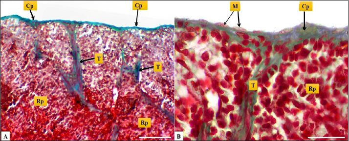 Fig. 2. (A): splenic capsule (Cp), splenic trabeculae (T), the splenic red pulp (Rp). (B): splenic mesothelial cells (serosal layer) (M), sub serosal layer, Masson’s Trichrome stain (A: scale bar=100 µm; B: scale bar=30).