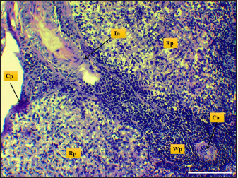Fig. 3. Microphotograph shows trabecular artery (Ta), central artery (Ca), splenic capsule (Cp), splenic red pulp (Rp), splenic white pulp (Wp) (H&E, Scale bar=100 µm).