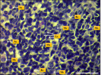 Fig. 5. Microphotograph shows different spleen cells, Lymphocytes (Lc), macrophages (Mc), neutrophils (Nt), reticular cells (Rc), and Mast cells (Ms) (H&E; Scale bar=30 µm).
