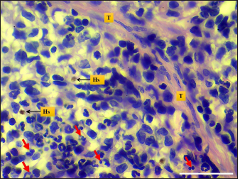Fig. 6. Microphotograph shows hemosiderin deposition (Hs), trabeculae (T), and the mitotic figures (red arrows) (H&E; Scale bar=30 µm).