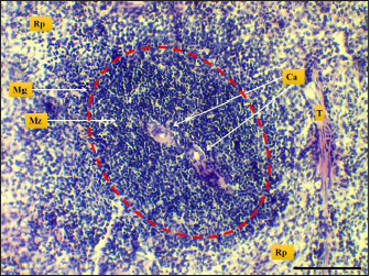 Fig. 7. Microphotograph shows white pulp (dashed circle), mantle zone (Mz), marginal zone (Mg), red pulp (Rp), central artery (Ca), capsule (Cp), and trabeculae (T) (H&E; Scale bar=100 µm).