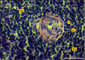 Fig. 8. Microphotograph shows central artery (dashed circle), endothelial cells (e), tunica media smooth muscle fibers (m), white pulp (Wp) (H&E; Scale bar=30 µm). The width of hamsters’ spleen is narrower in contrast to other animals, the authors (Dimitrov, 2012; Voloshin et al., 2014; Qasem et al., 2015; Uwah et al., 2021) reported that spleen widths in rats, guinea pigs, rabbits, and mice were 14, 12.2, 5.44, and 8,1 mm respectively. The weight of the spleen in hamster was nearly close to that of mice which were (0.240 ± 21.49 g) according to (Uwah et al., 2021), whereas the weight of the spleen in rats was 0.249 ± 0.61 g) (Voloshin et al., 2014), rabbits (0.547 ± 0.03 g) and in guinea pigs (0.641 ± 0.88 g) (Qasem et al., 2015). The microscopic architecture of the hamster’s spleen was similar to some laboratory animals, with minimal differences noticed in the spleen of other species, the spleen of the hamster is composed of two subserosal layers and from fibrous and muscular components, Cesta (2006) and Rahmoun et al. (2019) found that spleen in mice, rats and rabbits surrounded with two layers capsule, the inner composed of connective tissue and thin, smooth muscular lamina, and the outer consisting of mesothelial cells, these findings identical to the tablet of hamster spleen. On the other hand, Haley (2017) commented that the spleen in minipigs, cat, and dogs have a distinct thick capsule composed of interwoven layers of elastic and smooth muscle fibers, which differs from the hamster spleen Haley (2017) believe that the spleen in the mentioned animals is contractile and can change its size, expand to maintain blood storage while rodents’ spleen does not show contractile, rapidly empty and has a defense role.