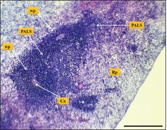 Fig. 9. Microphotograph shows white pulp follicles (Wp), red pulp (Rp), PALS, central artery (Ca) (H&E; Scale bar=300 µm).