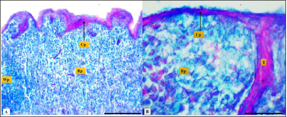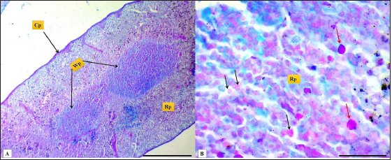 Fig. 11. Microphotograph (A&B) shows white pulp follicles (Wp), the red pulp (Rp), splenic capsule and trabeculum (T), PAS/AB 2.5 stain (A: scale bar=100 µm; B: scale bar=30 µm).