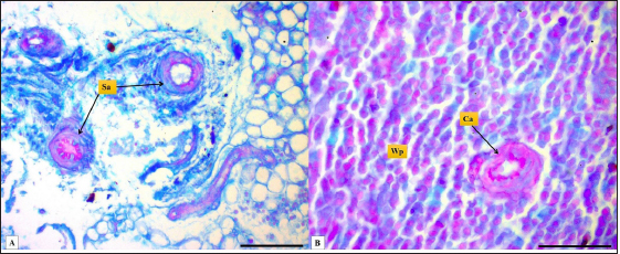 Fig. 12. Microphotograph (A&B) shows splenic arteries (Sa), central artery (Ca), white pulp (Wp) PAS/AB 2.5 stain, (A: scale bar=100 µm; B: scale bar=30 µm).