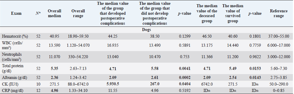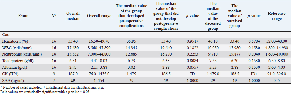 Table 1. Clinic-pathological variables related to complications and outcomes in dogs and cats (cont.)