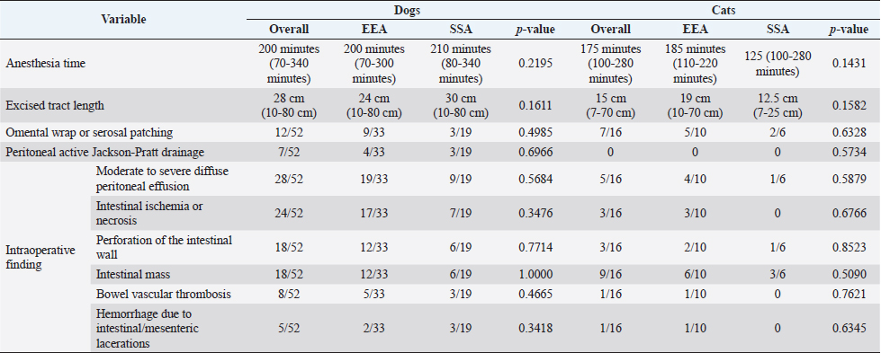 SurgeryEEA was performed in 33/52 dogs and 10/16 cats, while SSA was in 19/52 dogs and 6/16 cats. The jejunum-jejunal anastomosis was the most frequently performed in EEA (23/33 dogs, 8/10 cats) and SSA (14/19 dogs, 6/6 cats) groups. The duodenum-jejunal anastomosis was performed only in 4/33 dogs of the EEA group. The jejunum-ileal anastomosis was performed in 6/33 dogs and 1/10 cats in the EEA group and 3/19 dogs in the SSA group. The jejunum-colic anastomosis was performed in 2/19 dogs of the SSA group and 1/10 cats of the EEA group. Parts of duodenum were removed without ever involving pancreatic or biliary ducts. A single enterectomy and anastomosis was performed in all cases. One dog, presenting a jejunal mass treated with enterectomy and SSA, died intraoperatively from a cardiopulmonary arrest. No other intraoperative complications or decease were reported. Compared to EEA and SSA groups, information regarding intraoperative findings, anesthesia duration, excised tract length, omental wrap, or serosal patching performed, and application of peritoneal drainage connected to an active suction system, are summarized in Table 2. No significant differences were found in surgical findings, site and length of the excised tract, duration of anesthesia, and procedures performed between the two groups. Histopathological assessmentThe excised intestinal tract was submitted for histopathological assessment in 26/52 canine cases and 12/16 feline cases, with no significant differences between the two groups. Histopathological results are summarized in Table 3. Postoperative periodBlood products (packed red blood cells or fresh frozen plasma) were equally administered in EEA (6/33 dogs and 1/10 cats) and the SSA group (10/18 dogs and 1/6 cats). Generally, blood product administration was positively associated with the development of postoperative complications in dogs ( p=0.00009) and cats (p=0.05) and to a worse outcome in dogs ( p=0.00003), regardless of the group. No significant association was found between the type of antibiotics administered, peritoneal fluid culture positivity, bacteria isolated, and outcome between the two groups. Overall median hospitalization time was 5 days (range: 0–30 days) for dogs and 4 days (range: 1–19 days) for cats. In dogs, the median hospitalization time of the EEA group (4 days) was significantly shorter than that of the SSA group (8 days) ( p=0.0044). Median follow-up time was 34 days (range: 3–2,190 days) in dogs and 23.5 days (range: 2–350 days) in cats and did not differ between EEA and SSA groups. Complications and outcomeIn the EEA group, short-term complications were reported in 11/33 dogs and 3/10 cats. Minor complications occurred in 2/33 dogs and 1/10 cats: mild nonseptic peritonitis was reported in 1/33 dogs, while 1/33 dogs and 1/10 cats developed hypothermia, hypotension (systolic blood pressure ≤90 mmHg), and altered mentation, responsive to medical treatment. In 9/33 dogs and 2/10 cats, major complications occurred. Five dogs (5/33) and one cat (1/10) died postoperatively after developing severe sepsis and subsequent septic shock, without US suspicion of anastomosis dehiscence, probably due to the previous septic condition secondary to bowel perforation and septic peritonitis. Four dogs (4/33) and one cat (1/10) developed septic peritonitis and sepsis, with US indirect signs of anastomosis dehiscence (i.e., presence of free peritoneal fluid/gas, loss of intestinal wall stratigraphic detail, focal peritonitis at the site of anastomosis), which was confirmed on cytological evaluation of the abdominal effusion. The cat was euthanized for financial constraints, while a surgical revision was performed in all four dogs. During the second surgery, dehiscence of the intestinal anastomosis was confirmed in all cases, and a new enterectomy with EEA was performed. Three of them (3/4) died in the postoperative course due to sepsis and septic shock complications. Long-term complications in the EEA group occurred in 5/25 dogs and 2/8 cats. These were always minor and characterized by mild and occasional gastroenteric symptoms (inappetence, vomiting, or diarrhea). Overall postoperative mortality of the EEA group was 24.2% in dogs (8/33) and 20% in cats (2/10). In the SSA group, short-term complications occurred in 9/18 dogs and 1/6 cats. Minor complications occurred in 5/18 dogs and 1/6 cats: mild nonseptic peritonitis was reported in 4/18 dogs, while 1/18 dogs and 1/6 cats developed hypothermia, hypotension, and altered mentation responsive to medical treatment. Major complications occurred in 4/18 dogs: 2/18 died postoperatively due to septic shock, without US suspicion of dehiscence. In other 2/18 dogs, with clinical signs of septic peritonitis, dehiscence was suspected at the abdominal US and confirmed on cytological evaluation of the effusion. Animals were surgically revised, receiving a new enterectomy and SSA. Long-term complications of the SSA group were reported in 9/16 dogs and 4/6 cats: 6/16 dogs and 3/6 cats developed minor complications consistent with mild and sporadic gastroenteric symptoms. The only major complication, reported in 3/16 dogs and 1/6 cats, was the stricture of the anastomosis site, which required surgical revision with resection and SSA. Overall postoperative mortality in the SSA group was 11.1% in dogs (2/18). No cat in the SSA group died during the follow-up period. No significant differences in terms of complications or outcomes were found between the two groups (Table 4). Short-term complications occurred in 20/51 dogs and 4/16 cats, while long-term complications occurred in 14/41 dogs and 6/14 cats. The overall postoperative mortality rate was 19.6% in dogs (10/51) and 12.5% in cats (2/16). Considering both groups, dogs that developed short-term complications had significantly lower levels of total protein ( p=0.0041) and albumin ( p=0.0002) and higher levels of creatin-kinase (CK) ( p=0.0404) at the admission ti