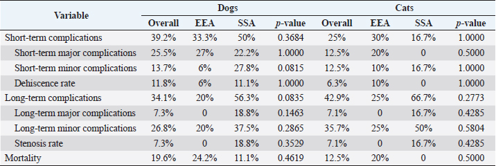 Table 4. Complications and outcomes in dogs and cats compared between EEA and SSA group.