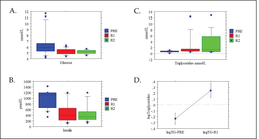 Fig. 1. Box and whisker plots. Raw data for pre-treatment baseline (PRE), the first (R1) and second (R2) retest following SGLT2 inhibitor intervention. (A): Glucose (mmol/l); PRE n=17, R1 n=17, R2 n=15. (B): Insulin (pmol/l); PRE n=20, R1 n=19, R2 n=18. (C): Triglycerides (TG; mmol/l); PRE n=10, R1 n=12, R2 n=12. (D): Log transformed triglycerides at pre-treatment baseline (PRE) and the first retest (R1). Table 1. Individual animal information.