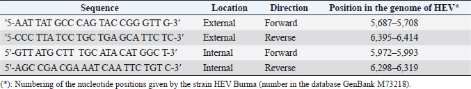 AbstractBackground: Hepatitis E virus (HEV) infection has a worldwide distribution and represents an important cause of acute hepatitis. Data on rabbit HEV prevalence and genetic diversity in hyperendemic regions (Egypt) are limited, per the information on rabbit HEV’s implications for human pathology. Aim: This study aimed to determine the prevalence of HEV infection in farmed rabbits from hyperendemic (Egypt) regions, as well as to examine the genetic relatedness of rabbit strains to human strains isolated in these regions. Methods: Anti-HEV was tested by ELISA from 164 serum samples isolated from rabbits in Egypt. HEV RNA was tested using reverse transcription of a nested polymerase chain reaction with degenerative primers to open reading frames 2 in feces samples from 355 farmed rabbits from Egypt (3 farms from different regions). Results: All of the animals were between the ages of 2 and 24 months. Age groups at various governorates, with the bulk of infections occurring between the ages of 2 and 12 months. HEV RNA prevalence in rabbits at the age between 2 and 12 months was varied in different governorates from 13.40%, 18.20%, and 32.10% in Qena, Luxor, and Assiut, respectively. While at the age between 12 and 24 months, HEV RNA prevalence in rabbits was 0.0%, 3.70%, and 4.30% in Assiut, Qena, and Luxor, respectively. Phylogenetic analysis did not reveal any relatedness of rabbit HEV strains neither to HEV genotype 3 sequences from patients with autochthonous hepatitis E in Egypt. Conclusion: HEV is prevalent in rabbits from Egypt with other rabbit strains belonging to species-specific group which is close to genotype 3. Keywords: HEV, Egypt, Rabbit, ELISA, Phylogenetic tree. IntroductionHepatitis E is a virus (HEV) that causes liver disease is found worldwide. In many developing countries, hepatitis E epidemics is responsible the disease, which is likewise endemic in few industrialized countries (Balayan et al., 1983; Sreenivasan et al., 1984). HEV belongs to the genus Hepevirus in the family Hepeviridae, is a small, icosahedral, spherical particles of 27–34 nm, non-enveloped virus with a single-stranded, positive-sense RNA genome of approximately 7.2 kb containing three open reading frames (ORFs), ORF1, ORF2 and ORF3, where ORF3 partially overlaps ORF2 (Fauquet et al., 2005). HEV divided into four genotypes with at least two putative new genotypes belong to only one serotype that can infect mammals, named after the place of isolation of the reference strains. Two of the genotypes contain strains that only infect people (HEV-1 “Burma,” HEV-2 “Mexico”); the other two genotypes (HEV-3 “USA,” HEV-4 “China”) compries viruses isolated from both human and animal samples (Worm et al., 2002). HEV has been genetically identified in rats, wild boars, domestic swine, mongooses, rabbits, chickens, ferrets, cutthroat trout, bats, and deer (Lhomme et al., 2013). HEV is considered hyperendemic in many developing countries, with a prevalence of up to 25%, acute hepatitis cases transmitted via the fecal-oral route and associated with contamination of drinking water by HEV genotypes 1 and 2. While, HEV is regarded endemic in industrialized countries, where the prevalence of HEV is less than 25% of acute hepatitis cases (Ashbolt, 2004). HEV is transmitted zoonotically by the consumption of contaminated meat and meat products or by contact with infected animals (Petral et al., 2013). Following the discovery of an HEV strain in a rabbit that belongs to genotype 3, rabbits were evaluated as a potential HEV animal model (Wang et al., 2002). Rabbits inoculated with the rabbit HEV shed virus in feces were viremic and exhibited increased serum ALT activity, as well as irregular multifocal lymphohistiocytic in filtrates and local hepatocellular necrosis (Prinja et al., 2008). Liu et al. (2013) reported that two of the nine rabbits inoculated with human HEV genotype 4 developed viremia and fecal virus shredding, whereas none of the rabbits inoculated with human HEV genotype 1 developed viremia or fecal virus shredding. Although rabbits may be of limited utility as a model for studies of human HEV genotypes 1 and 2, the rabbit model of HEV infection may be useful for evaluating some characteristics of HEV infection and replication of the rabbit HEV strain. Given the genetic identification of zoonotic genotype 3 HEV strains in rabbits from China, the United States, and France (Cossaboom et al., 2012a; Izopet et al., 2012; Birke et al., 2014), Rabbits could serve as reservoir hosts for the transfer of HEV to humans. Rabbits are susceptible to human HEV infection of genotype 4, and infected rabbits developed viremia, anti-HEV seroconversion, and fecal virus shredding (Liu et al., 2014). The rabbit HEV is closely related to other mammalian HEV both genetically and antigenically. The capsid protein of the HEV strain genotype 3 rabbit was capable of cross-reacting with antibodies from other HEV strains such as rat, swine, human, and chicken (Ma et al., 2010). Rabbit HEV, like swine HEV in pigs, is widely spread throughout the rabbit population. So, similar to swine HEV, direct contact with infected rabbits, consumption of undercooked or raw rabbit meats, and water contaminated with rabbit HEV could all be sources of human infection (Cossaboom et al., 2012b). A rabbit-HEV was discovered in a patient, implying that rabbit HEV can be transmitted to humans. The contribution of rabbit HEV to the epidemiology of hepatitis E in humans is uncertain (Wang et al., 2013). HEV is endemic in southwest France, with an annual incidence of 3.2% locally acquired HEV infections (Jeblaoui et al., 2013). Consumption of not farmed animal meats, primarily wild boar, deer, and wild rabbits, was revealed to be the only factor independently associated with HEV infection in a case-control investigation (Cheng et al., 2012). Molecular data from several studies carried out in France, on the other hand, show that the majori